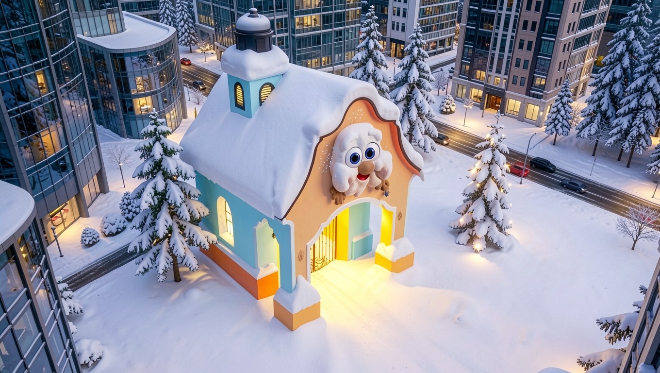 Зимний сказочный домик в центре современного города
