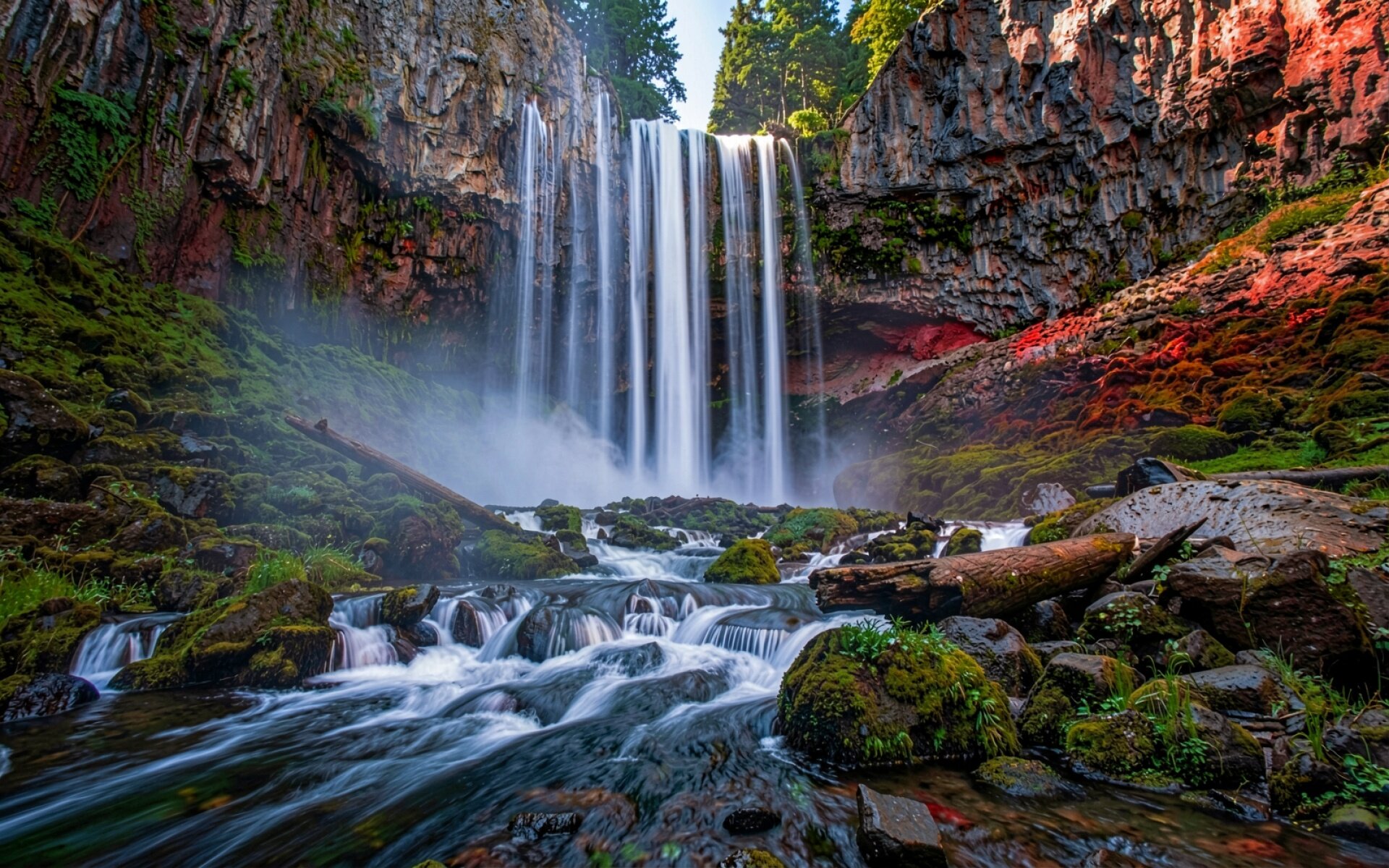 Водопад в скалах с зеленым мхом