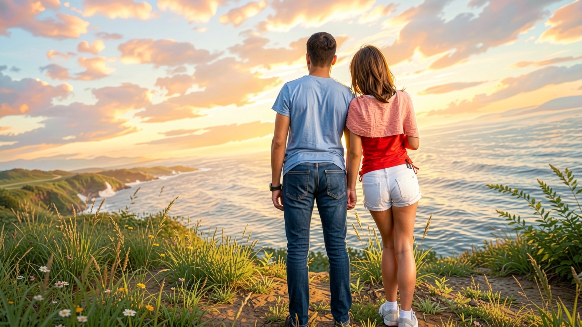 Пара влюбленных на скале во время заката