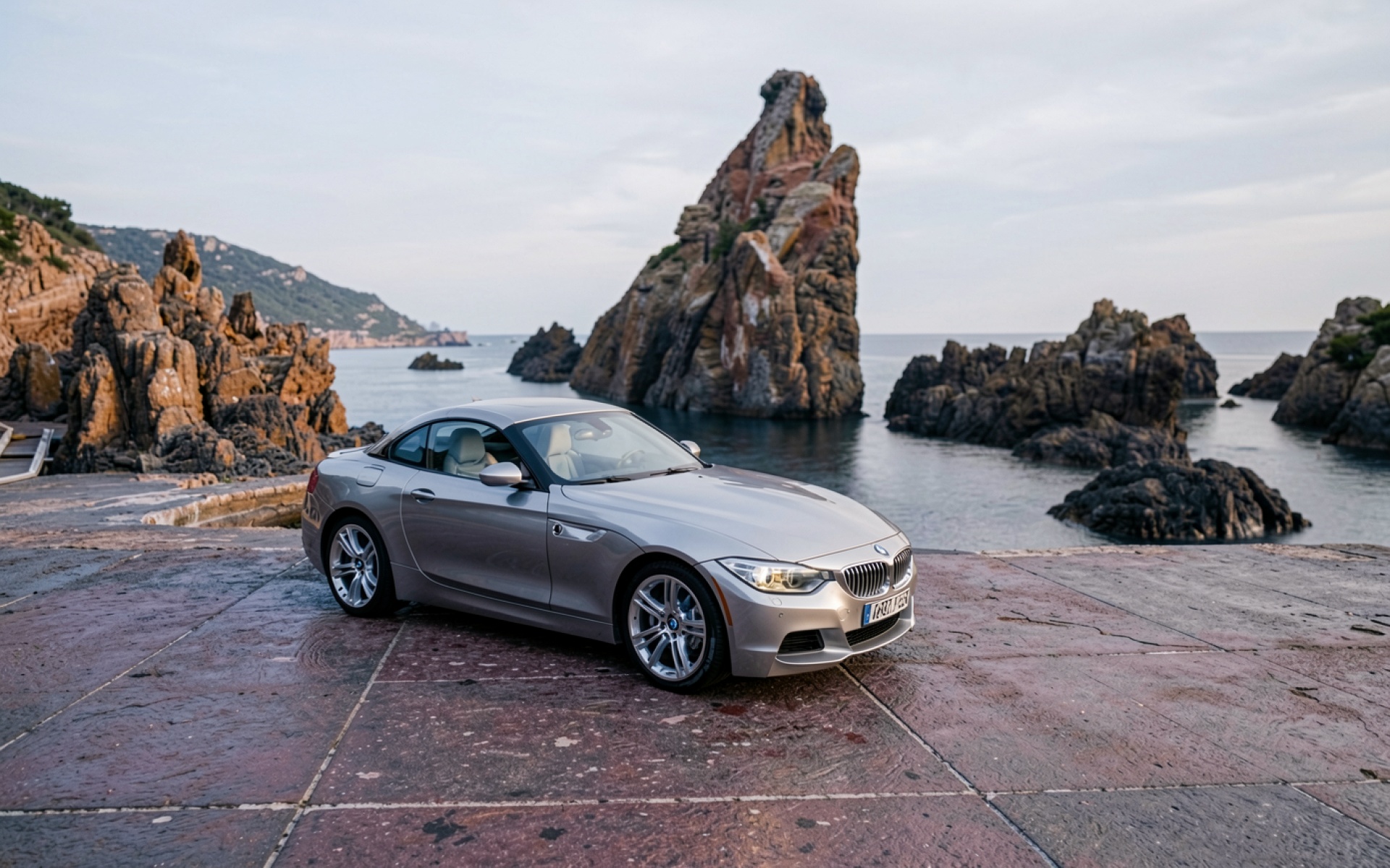 Серебристый BMW Z4 на фоне скалистого берега