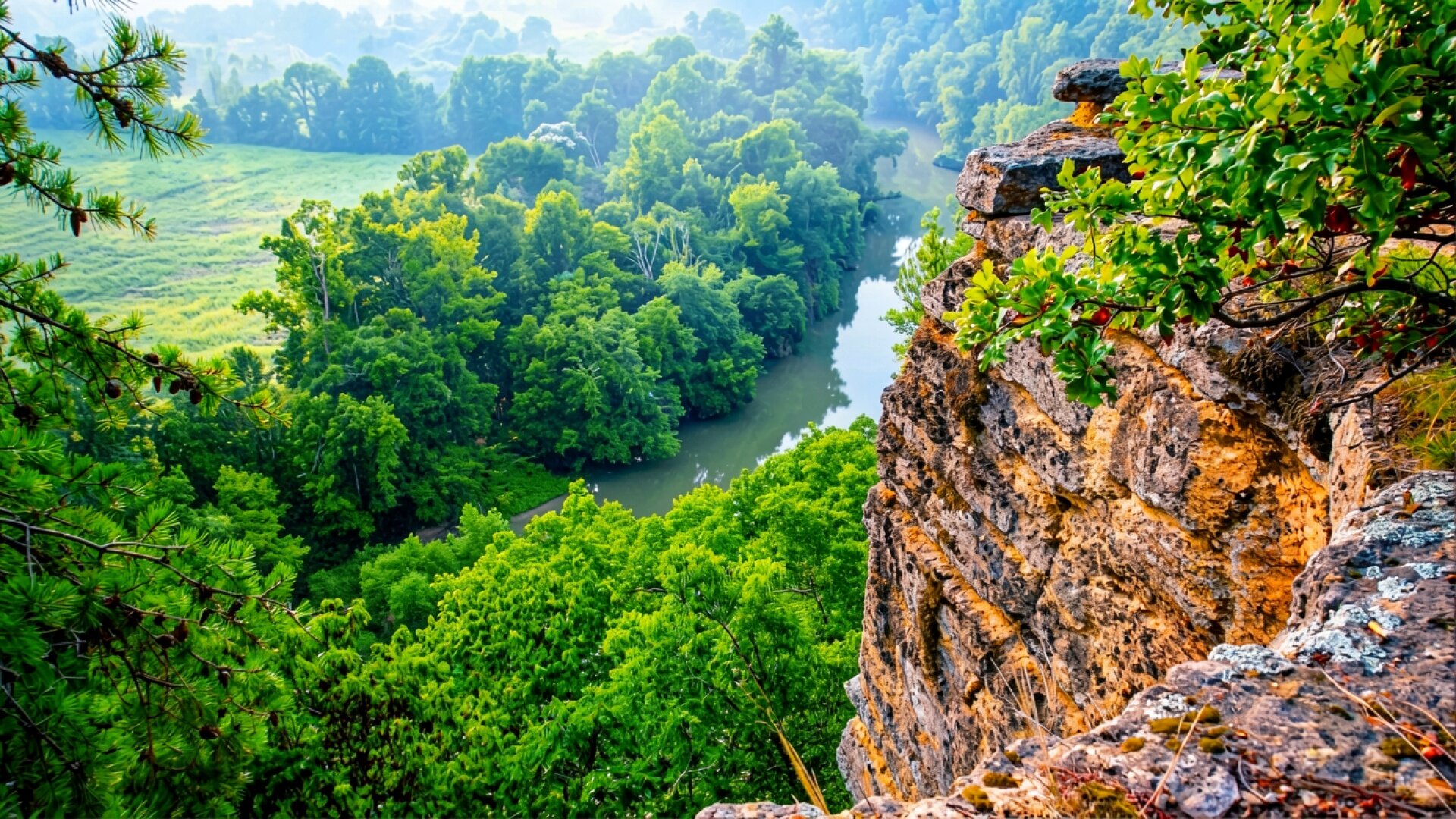 Вид на реку с высокого скалистого обрыва