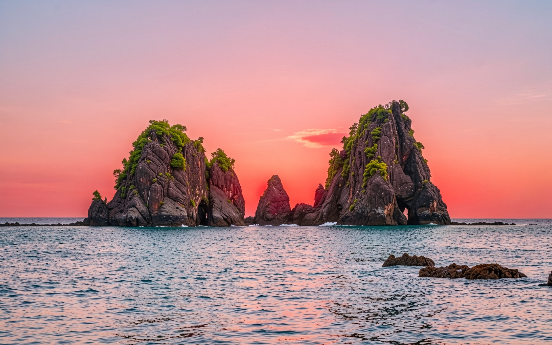 Скалистые острова в океане при розовом закате