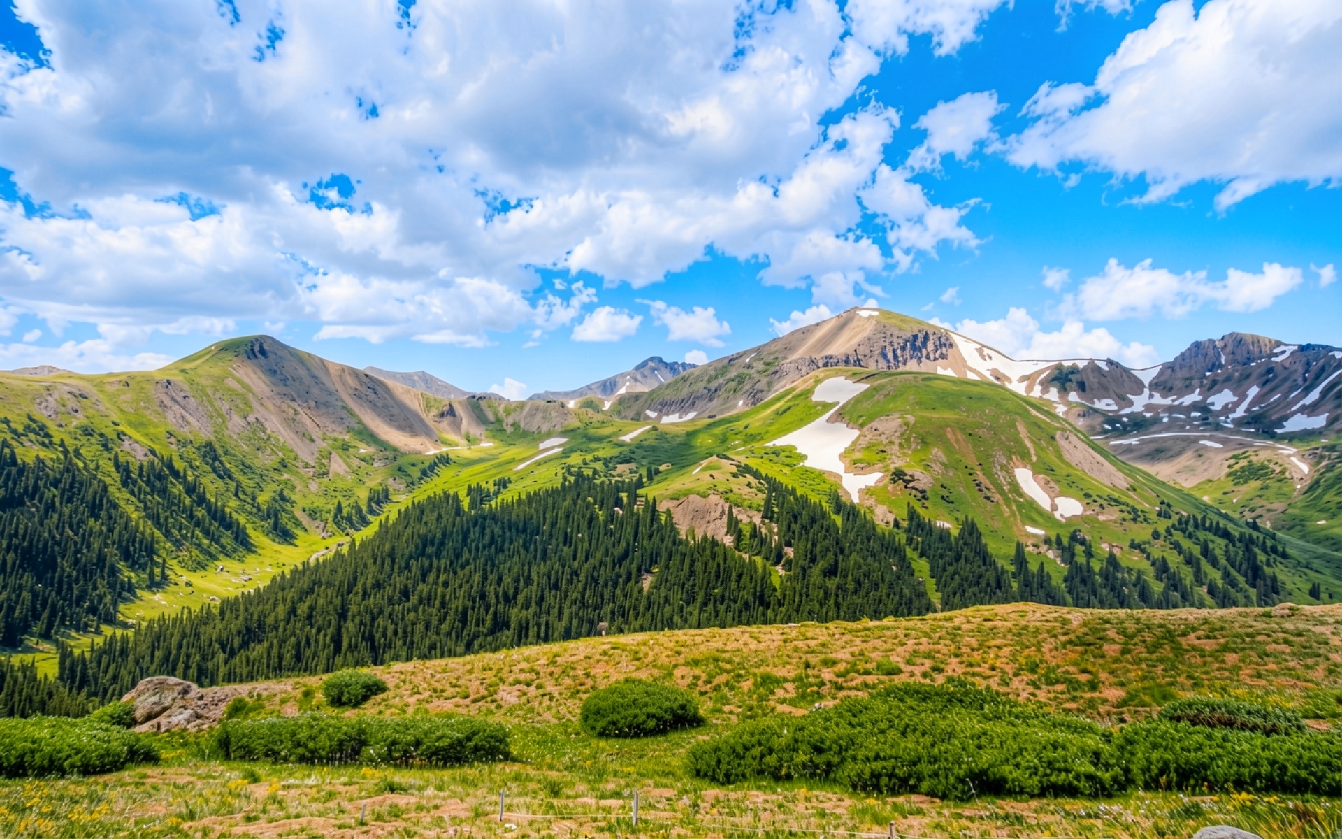 Горный пейзаж с зелеными склонами и облаками