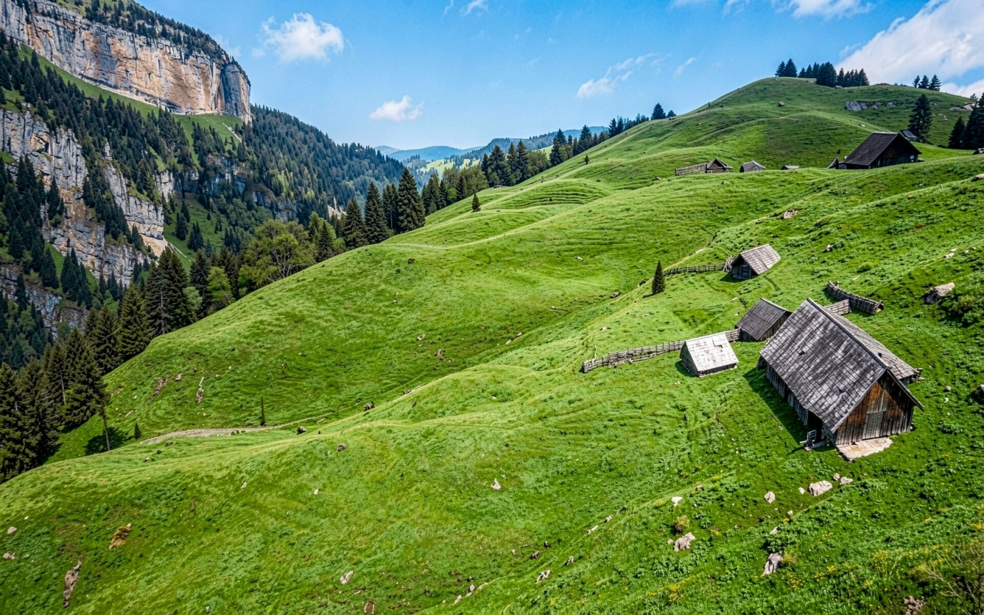 Деревянные хижины на зеленых склонах Альп