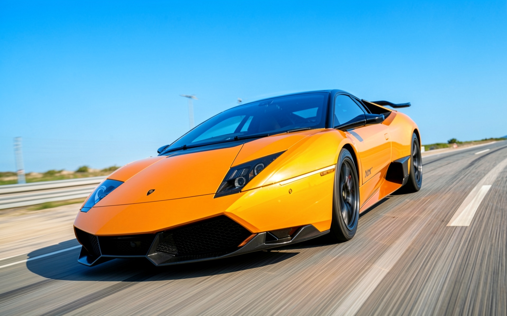 Оранжевый суперкар Lamborghini на скоростном шоссе