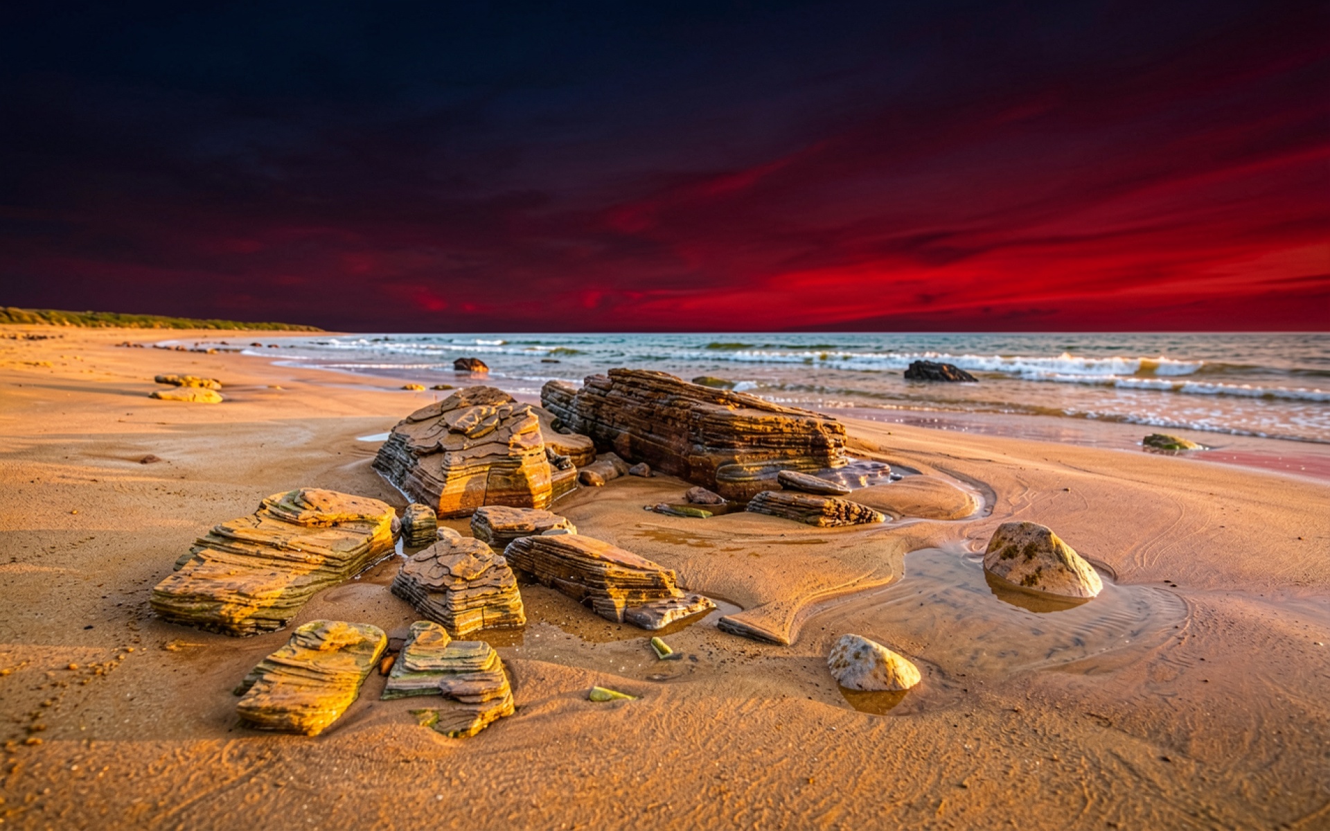 Слоистые скалы на песчаном пляже при красном закате