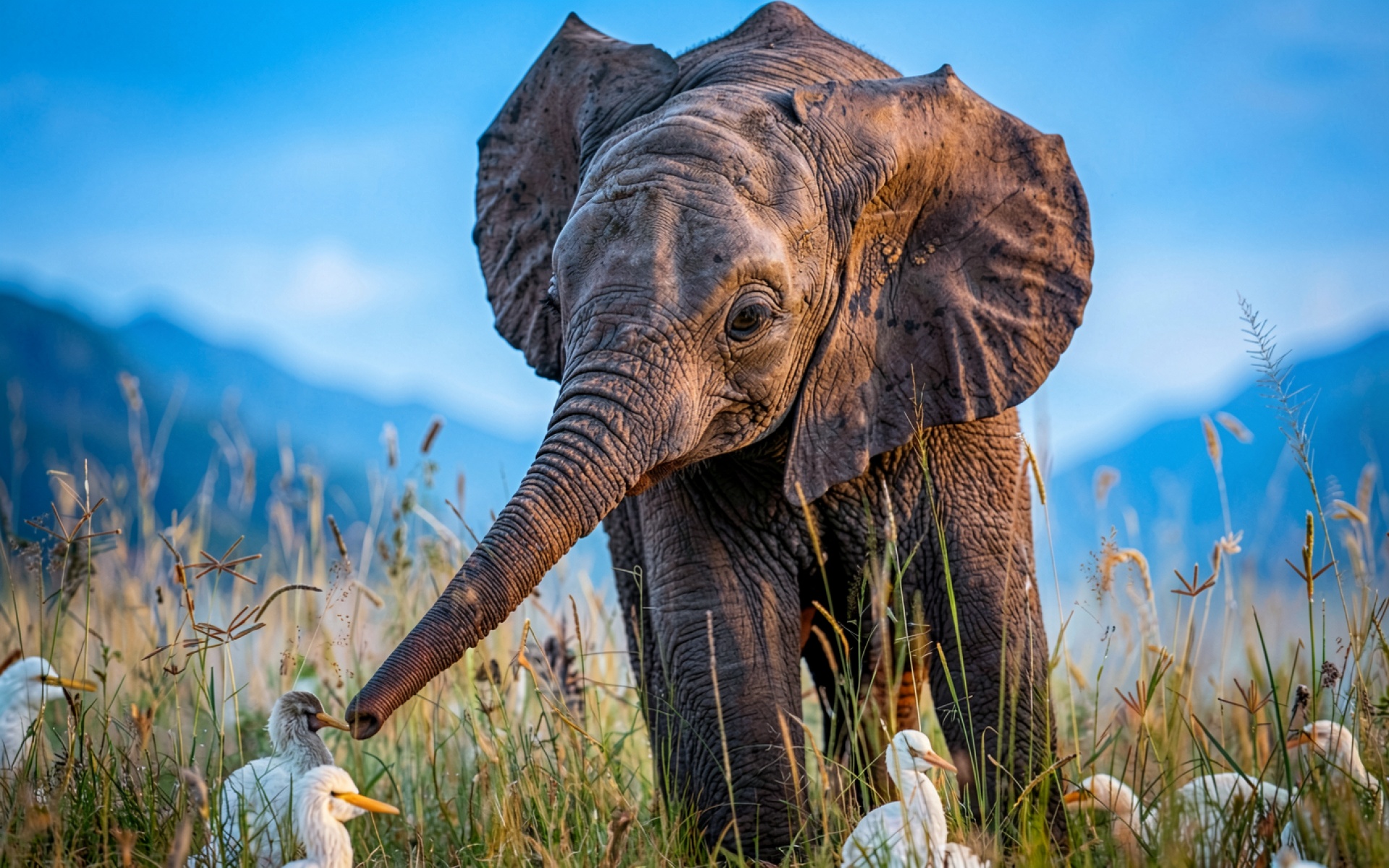 Слоненок с белыми цаплями в высокой траве