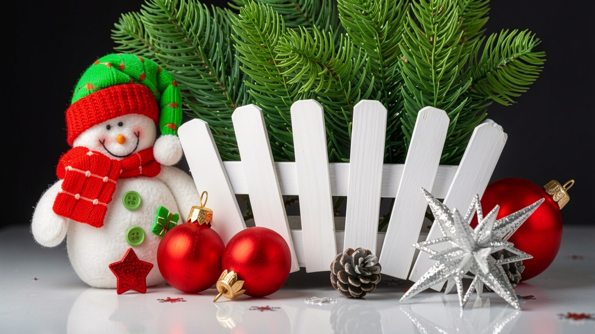Снеговик в новогоднем декоре с красными шарами
