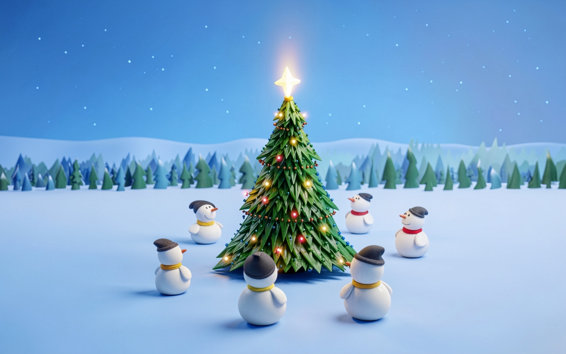 Снеговики вокруг новогодней елки в зимнем лесу