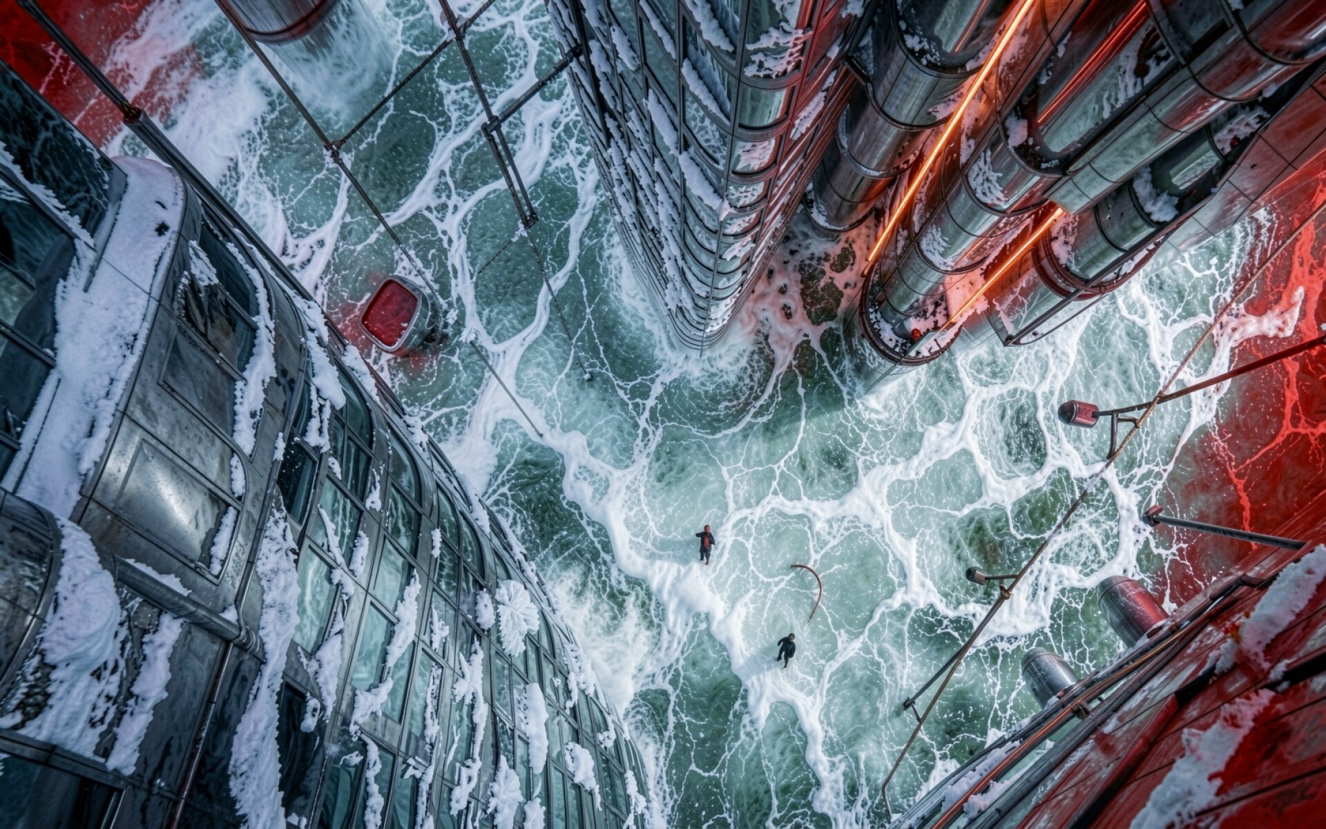 Футуристический город в снегу с красными акцентами
