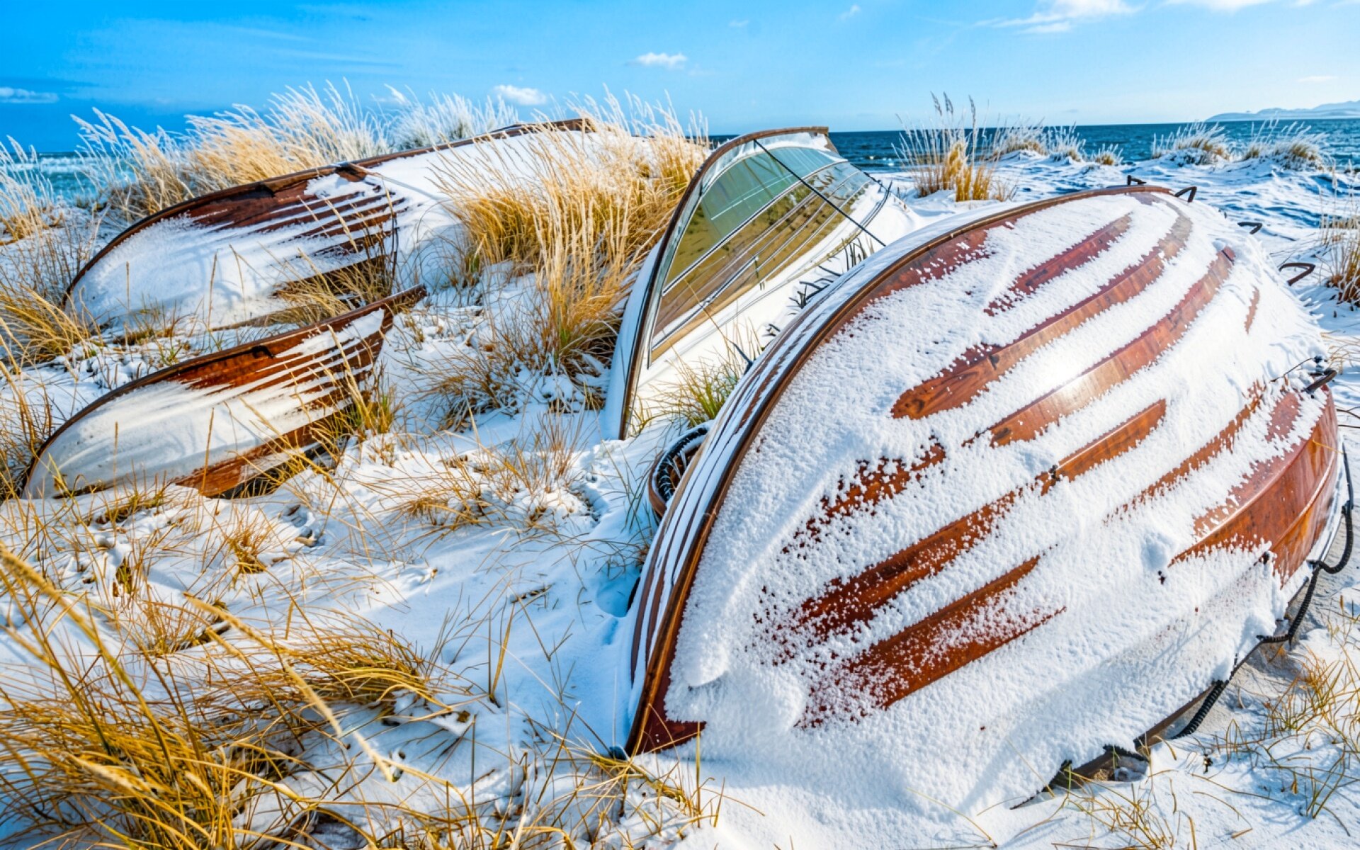 Деревянные лодки в снегу на берегу