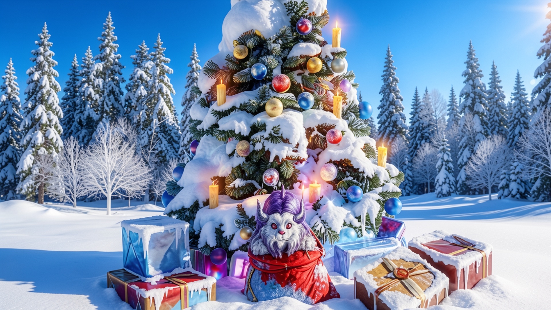 Пушистый монстр у новогодней елки в снежном лесу