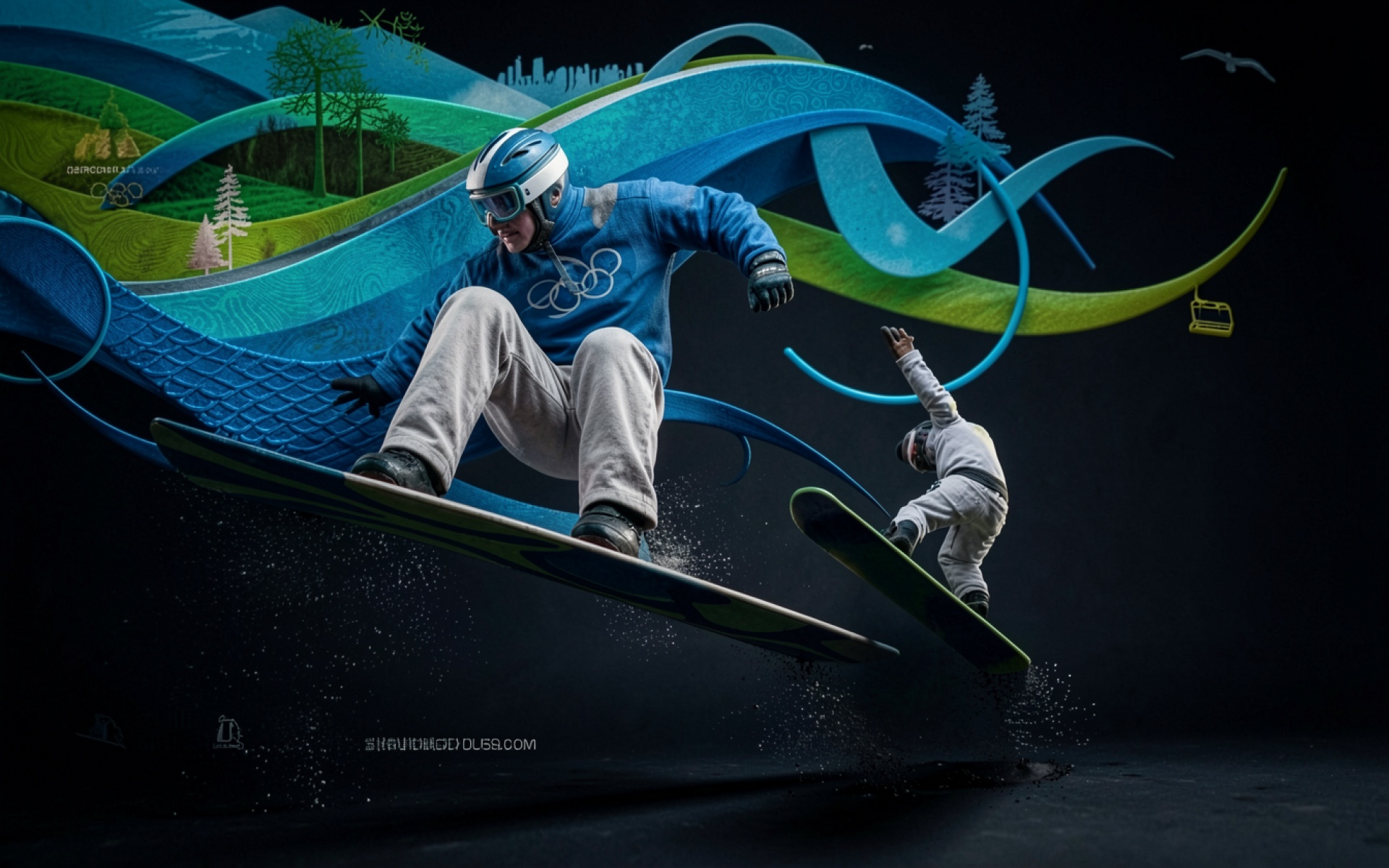 Сноубордисты в синих динамичных абстрактных волнах