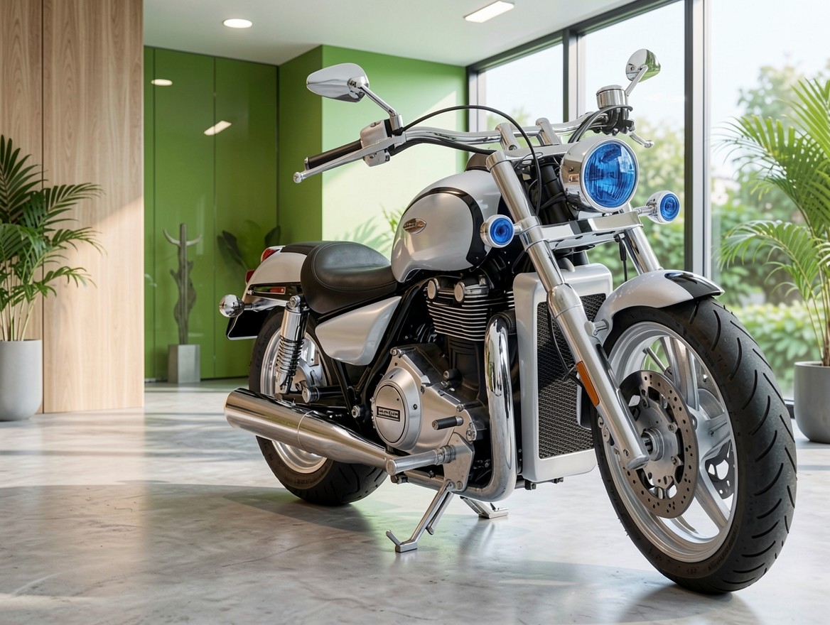 Серебристый мотоцикл в современном светлом интерьере