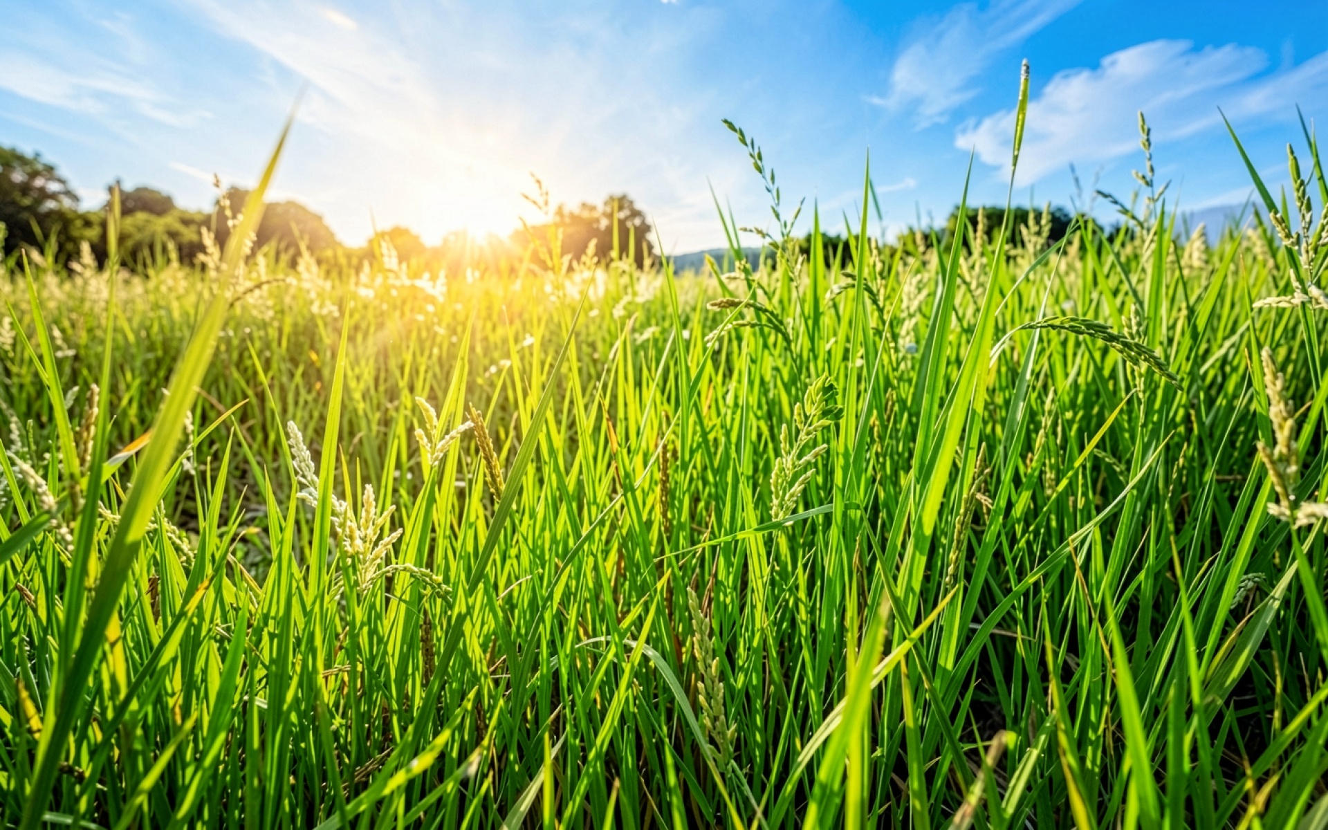 Зеленое рисовое поле при ярком солнечном свете