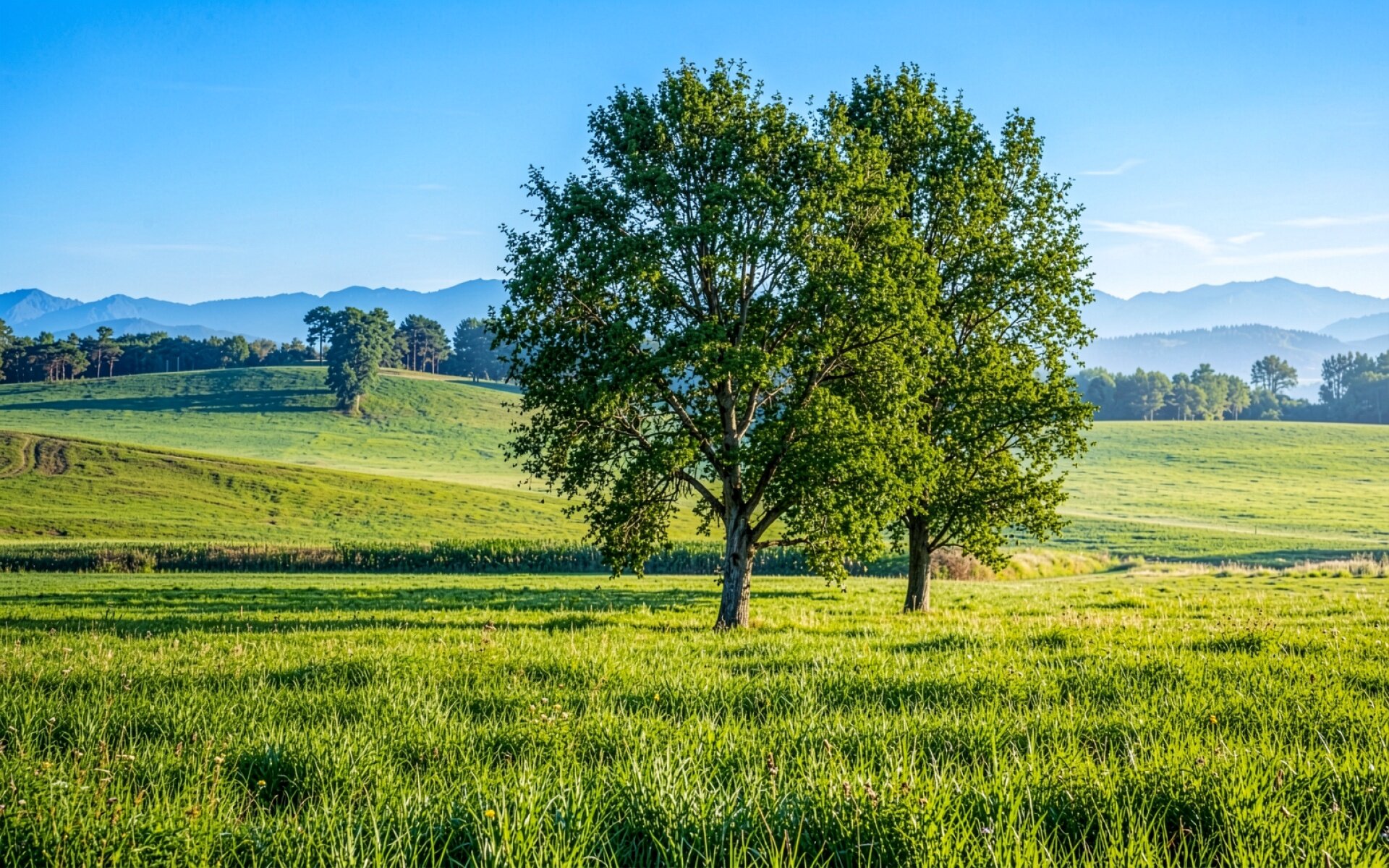 Зеленые деревья в солнечном летнем лугу