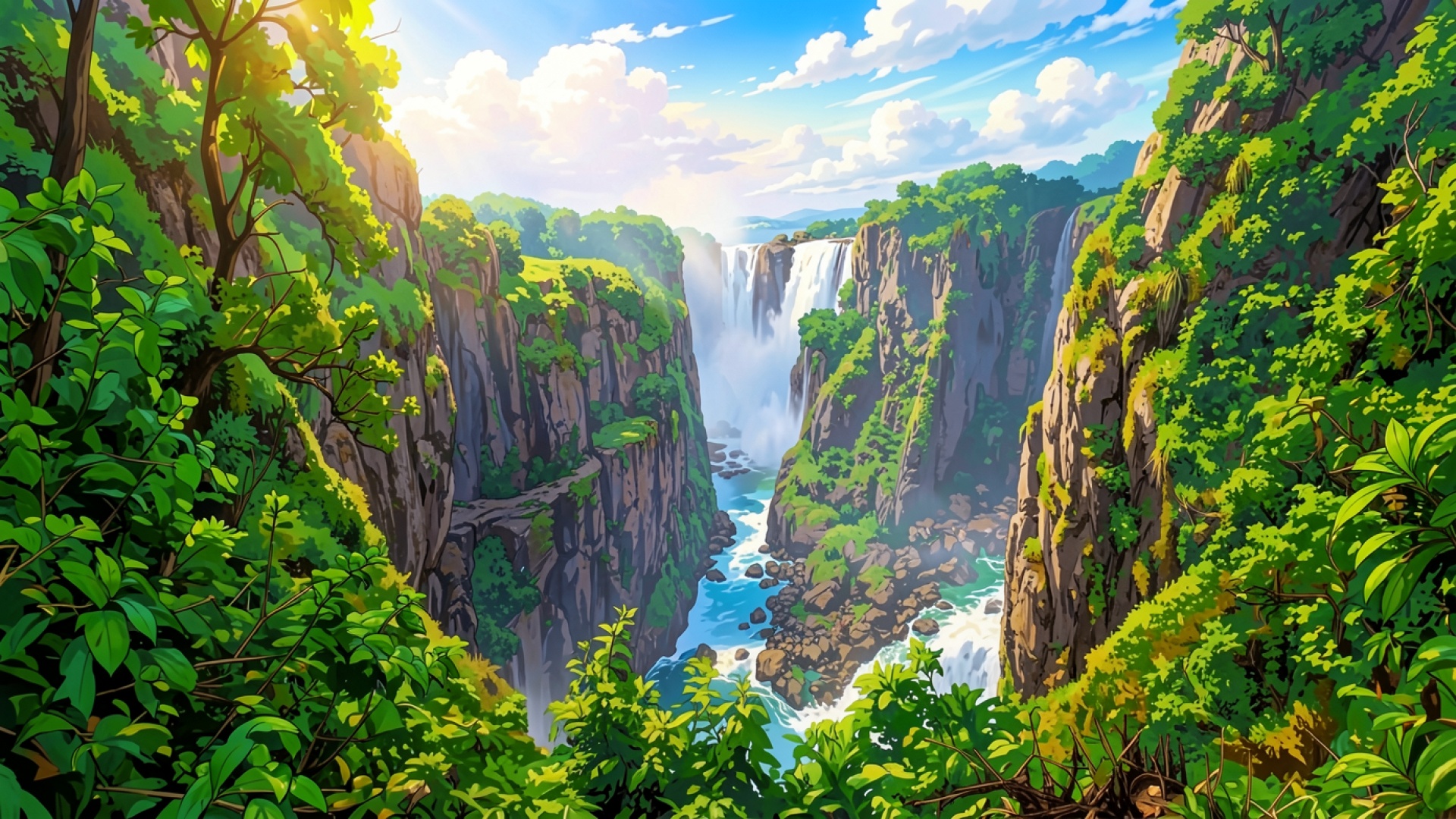 Тропический водопад в зеленых джунглях при солнечном свете
