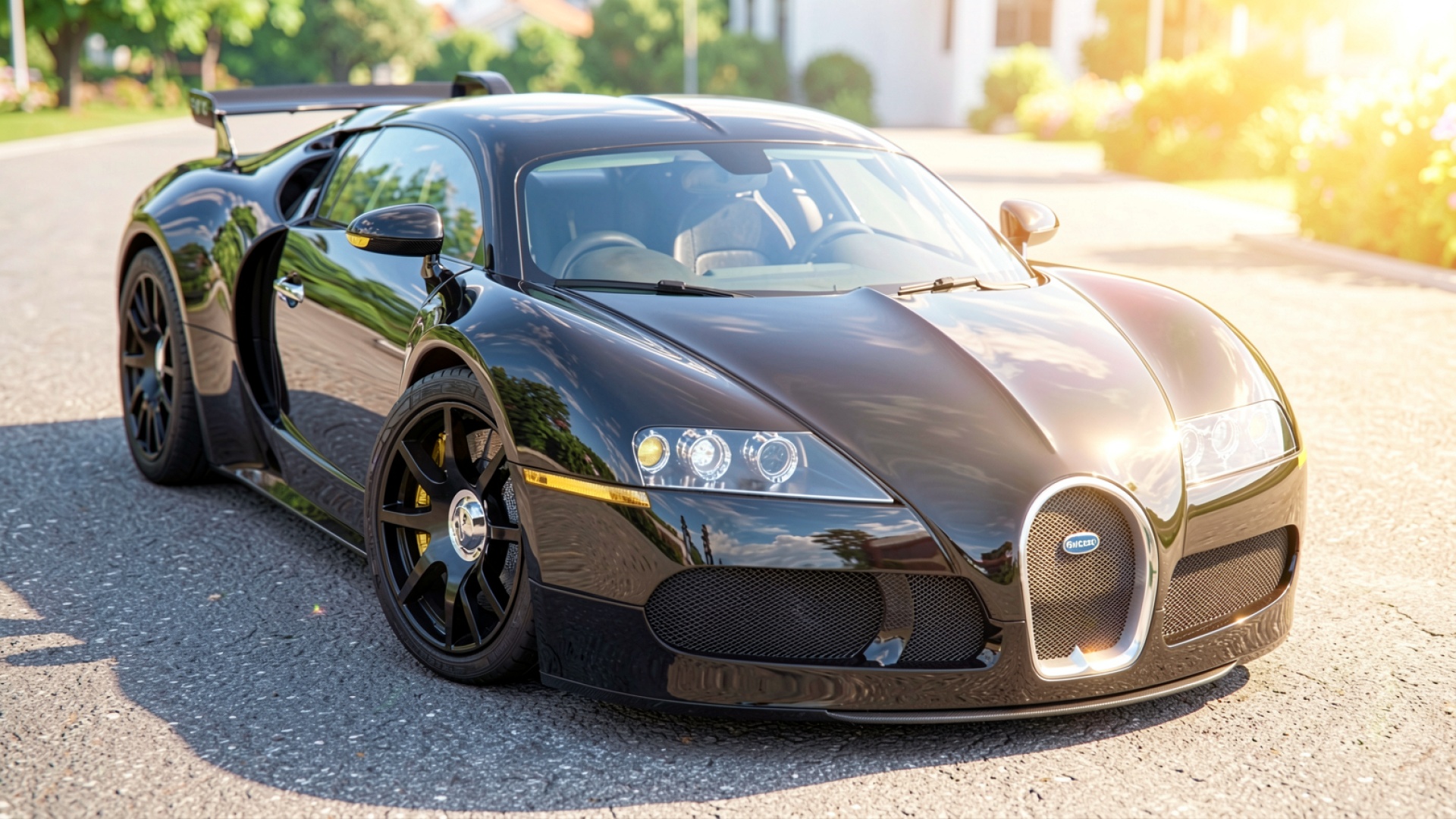Черный гиперкар Bugatti Veyron в солнечном городе