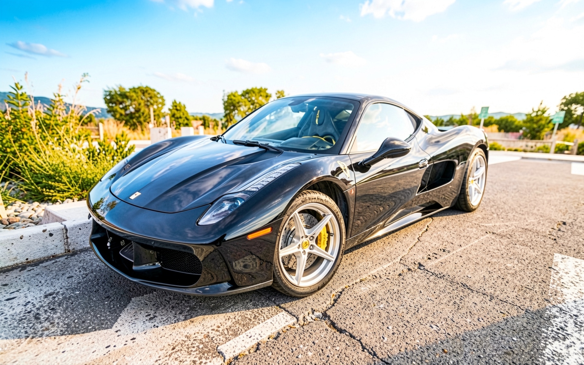 Черный спорткар Ferrari на солнечном шоссе