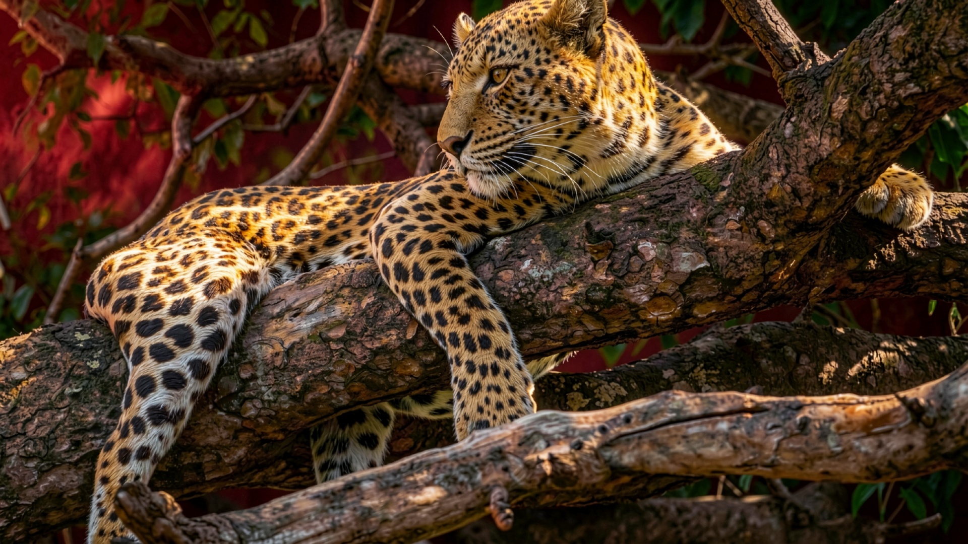 Леопард на толстой ветке дерева в солнечный день