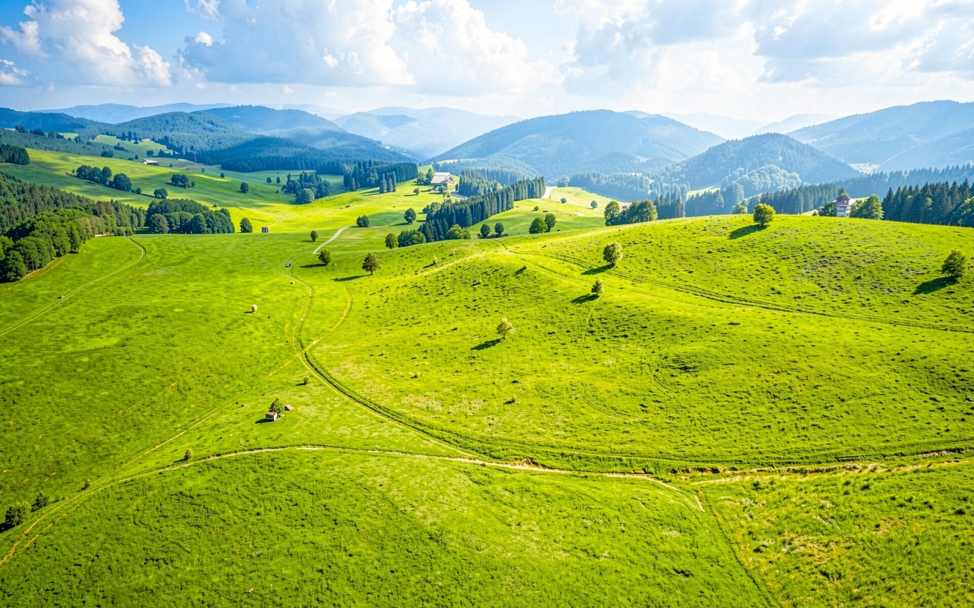 Зеленый горный пейзаж с солнечным освещением