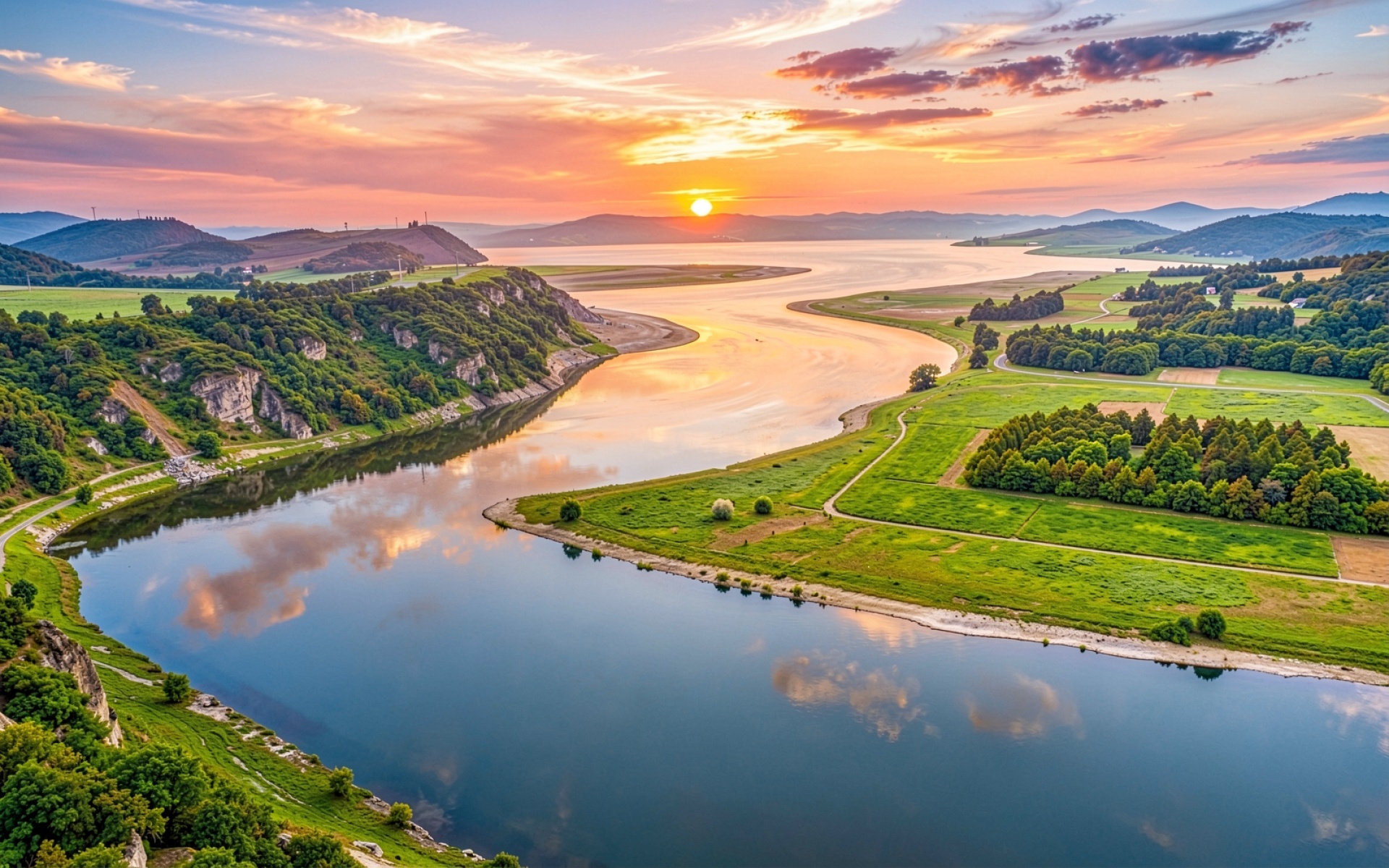 Пейзаж извилистая река закатное солнце