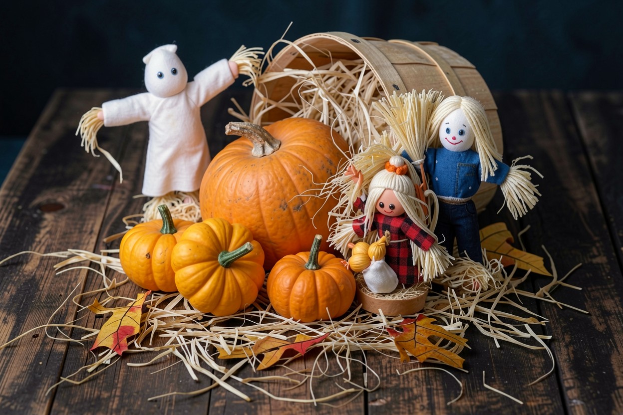 Осенний натюрморт с тыквами и соломенными куклами
