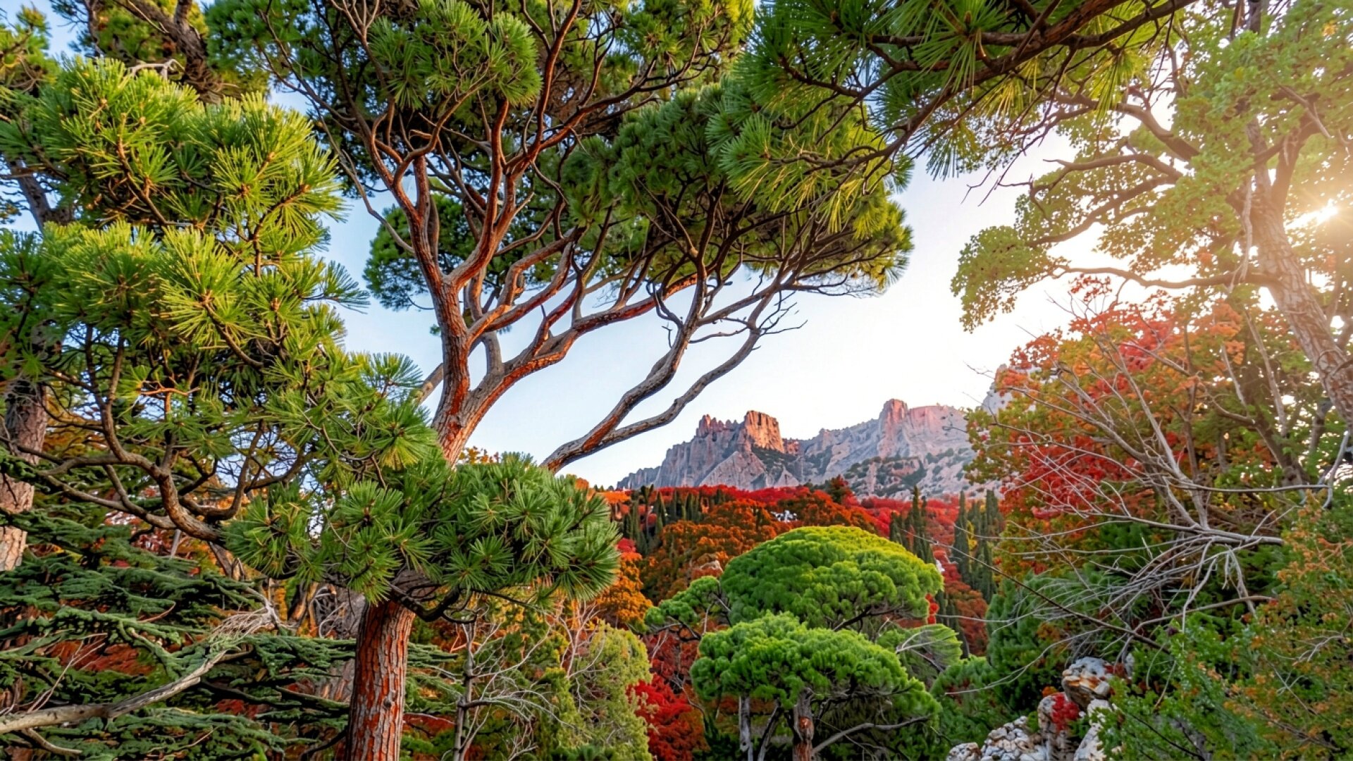 Осенний пейзаж с соснами и горами