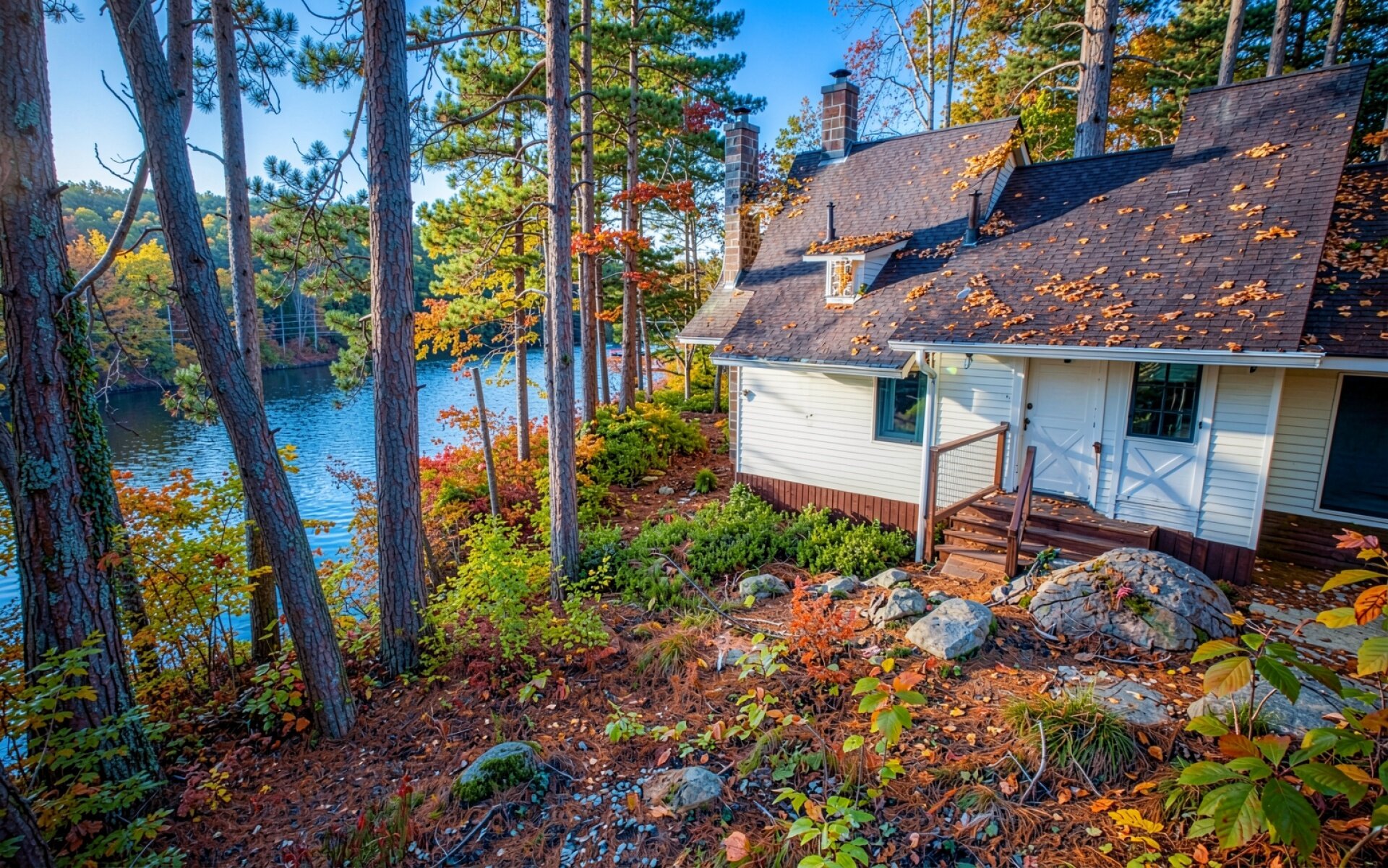 Белый загородный дом в осеннем сосновом лесу