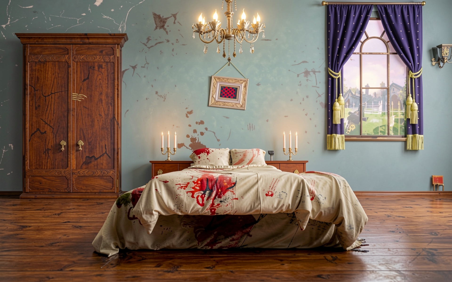 Спальня с заброшенным интерьером и красными пятнами