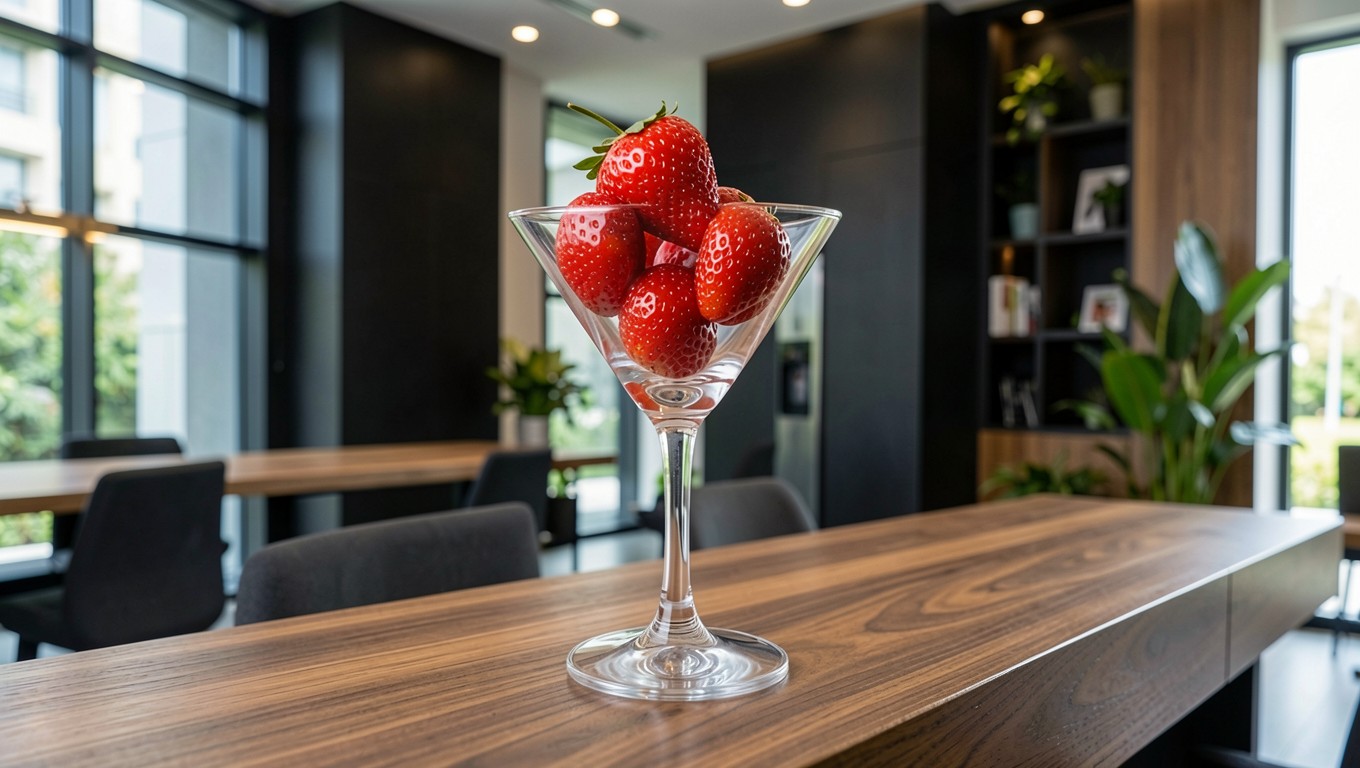 Спелая клубника в стеклянном бокале в офисе