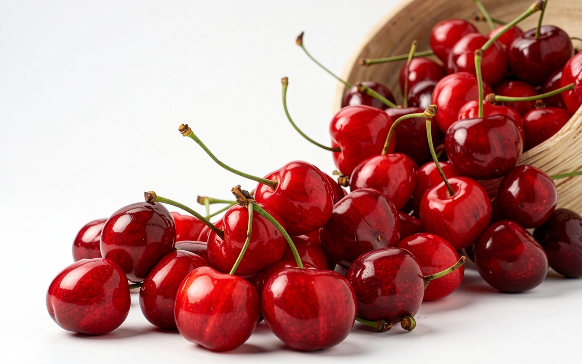 Спелые красные ягоды вишни в плетеной корзине