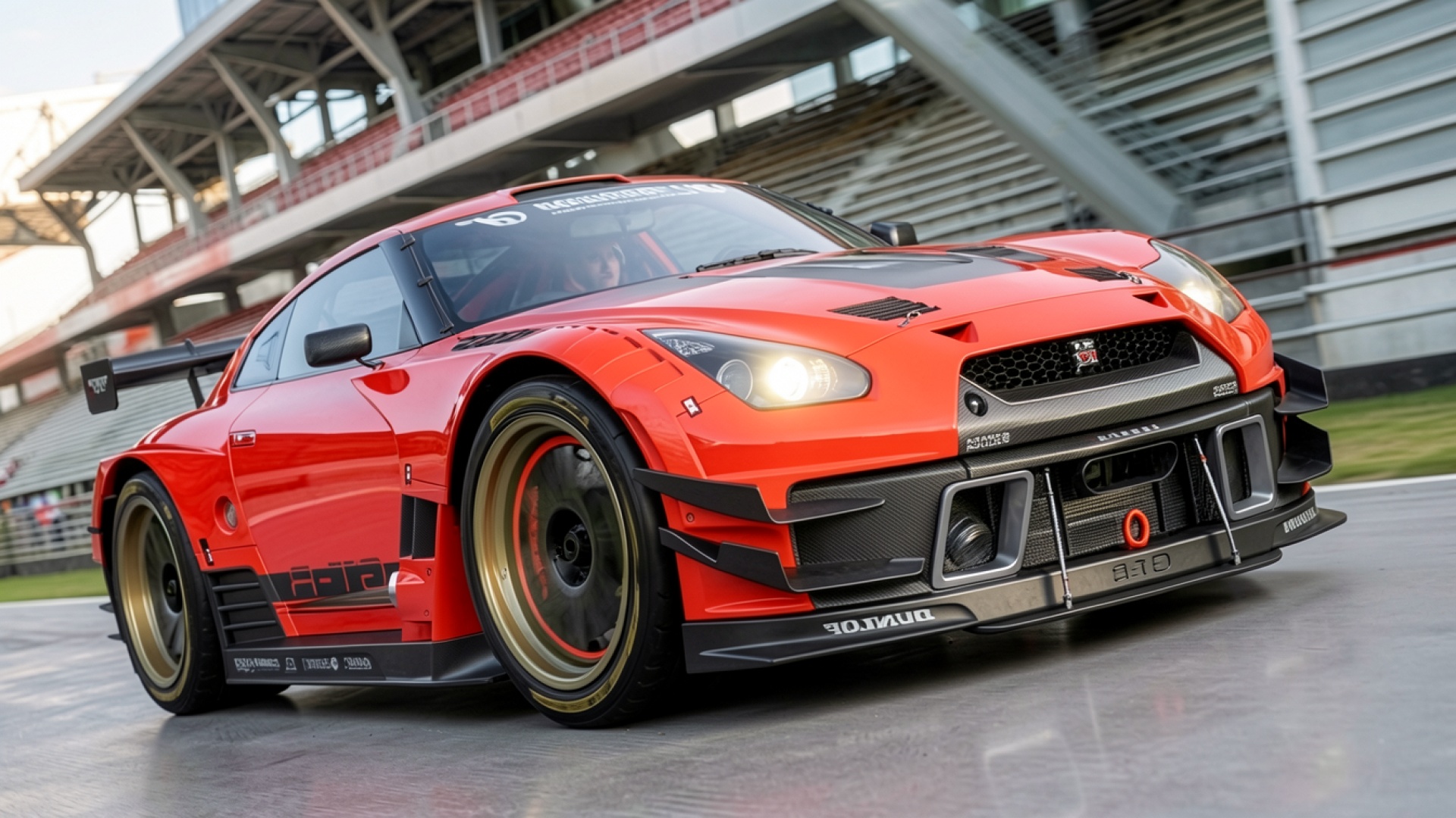 Красный спортивный автомобиль Nissan GT-R на гоночном треке