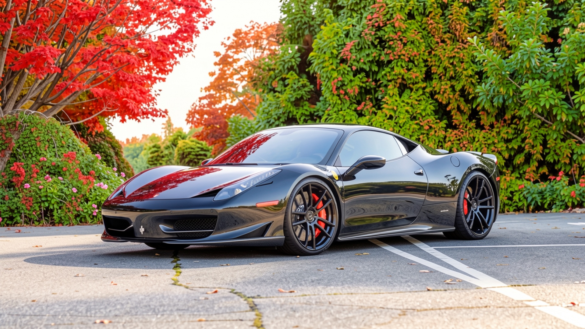 Черный спорткар Ferrari на фоне осенних деревьев