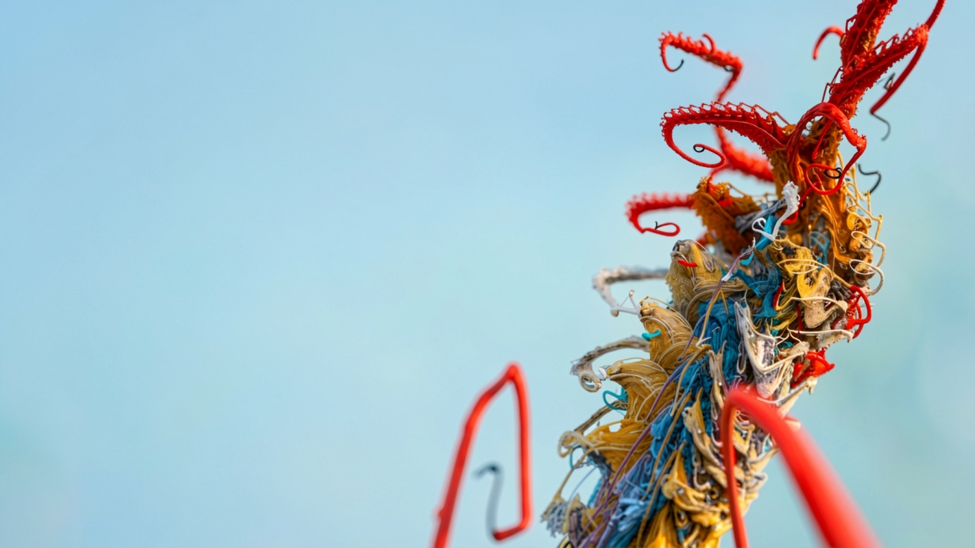 Спутанные разноцветные провода на голубом фоне