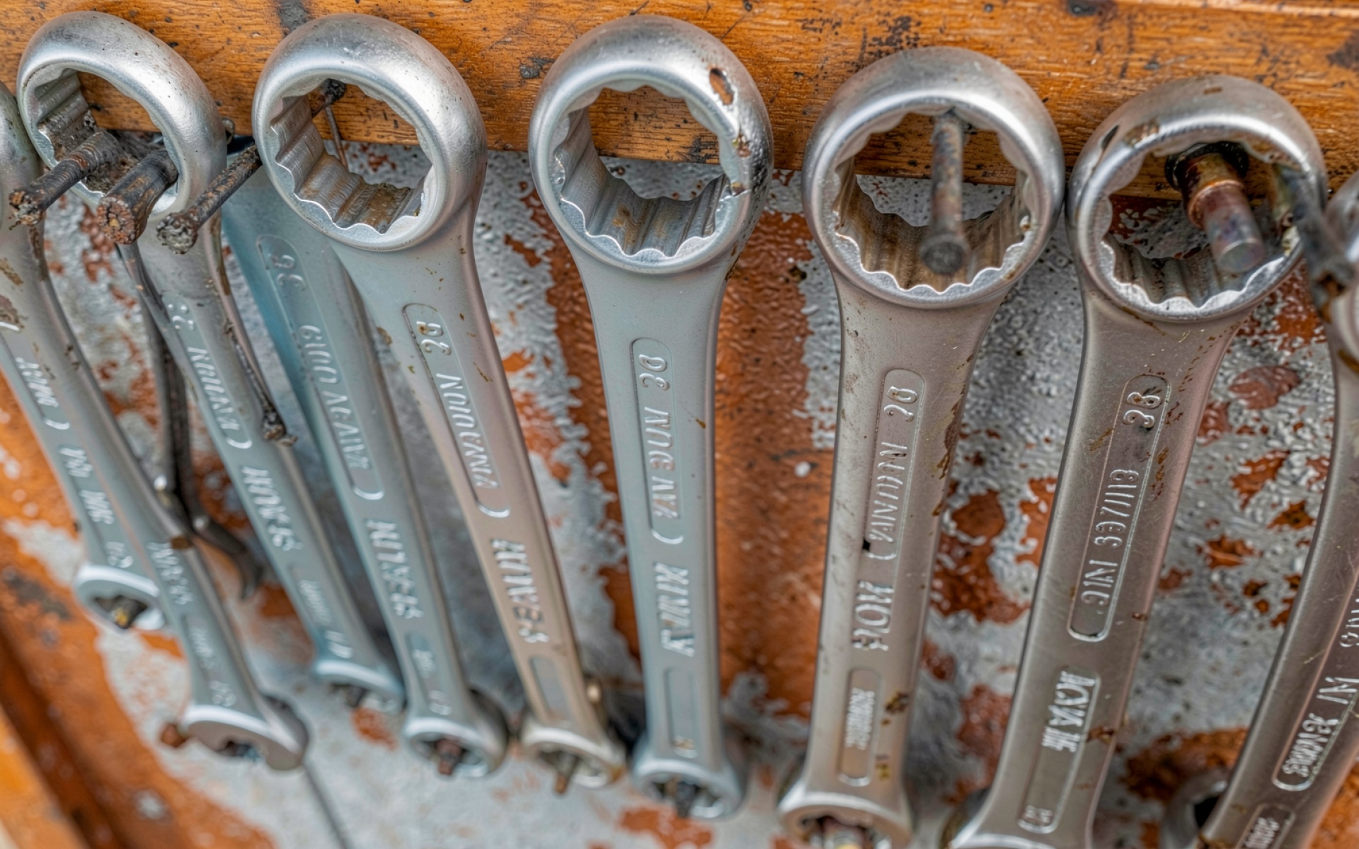 Набор стальных гаечных ключей в гараже