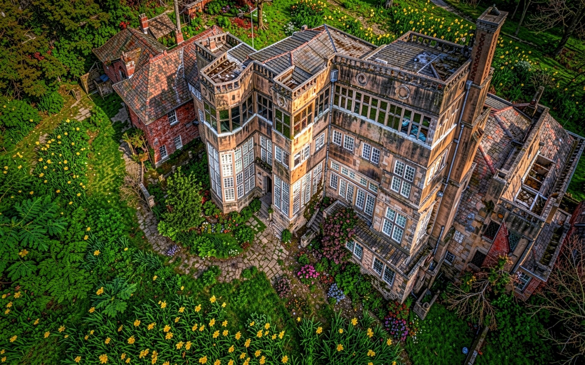 Старинный каменный особняк в цветущем весеннем саду