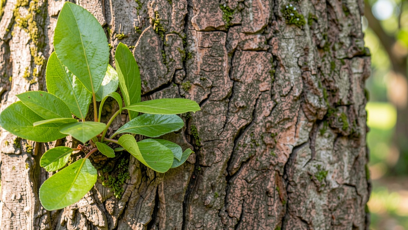 Зеленый росток на коре старого дерева