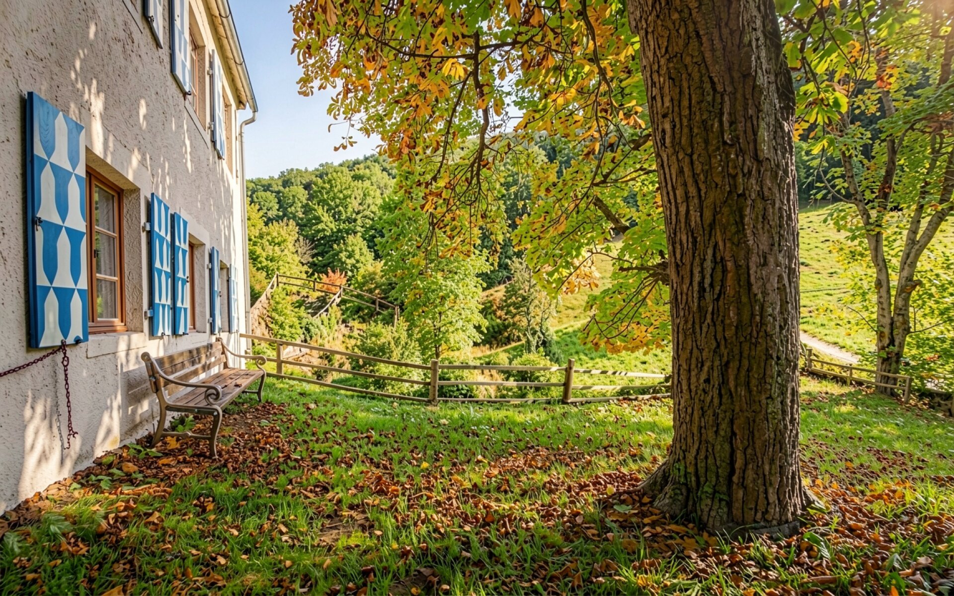Старый дом с синими ставнями осенью