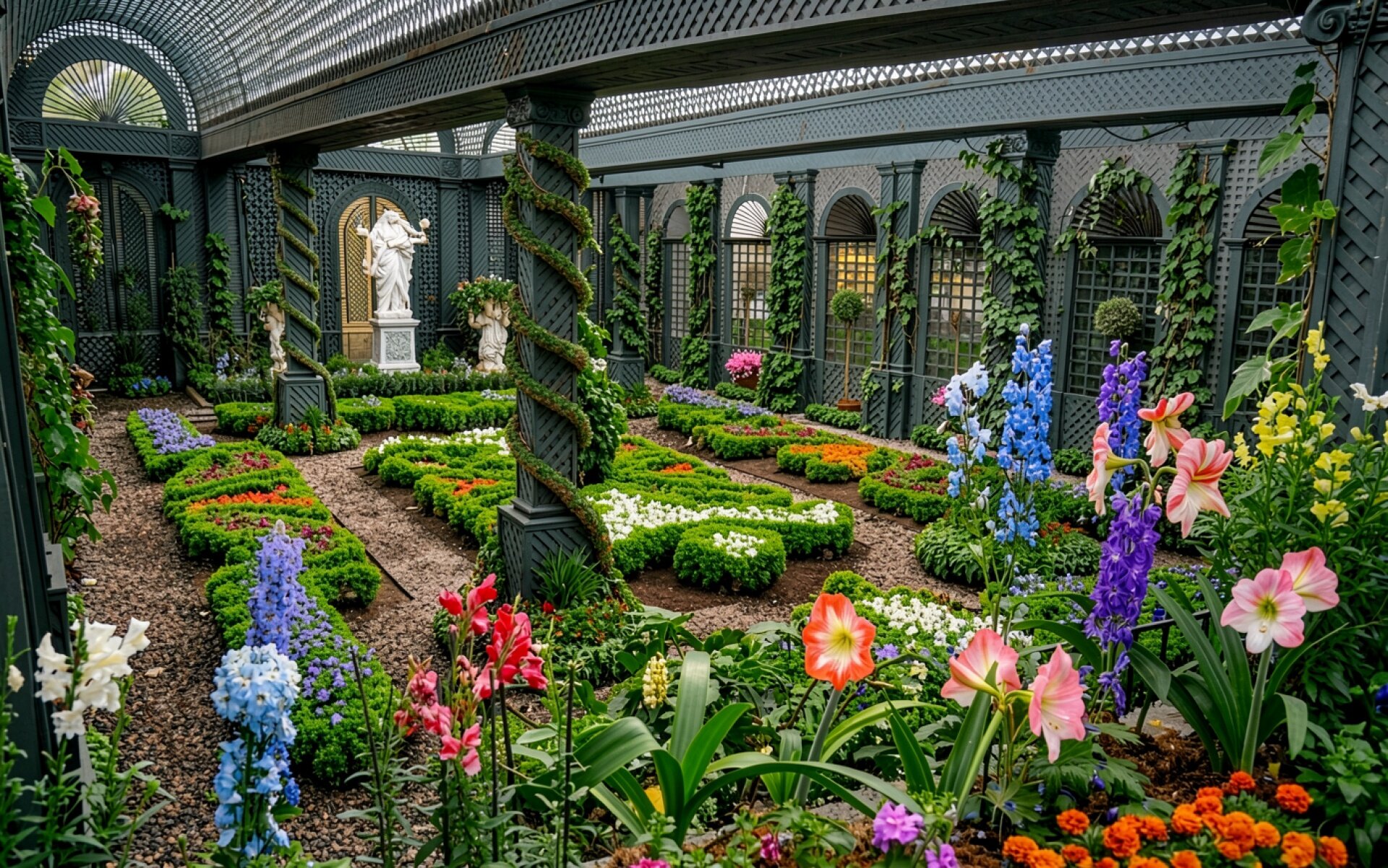 Цветущий викторианский сад с мраморной статуей