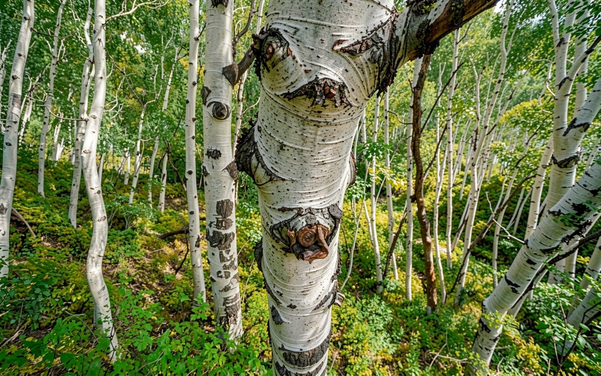 Белые стволы берез в зеленом лесу