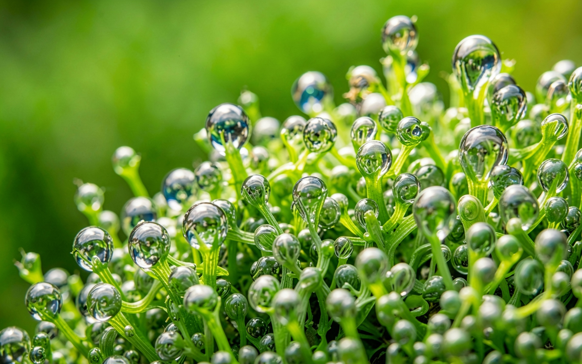 Капли росы на зеленых стеблях мха