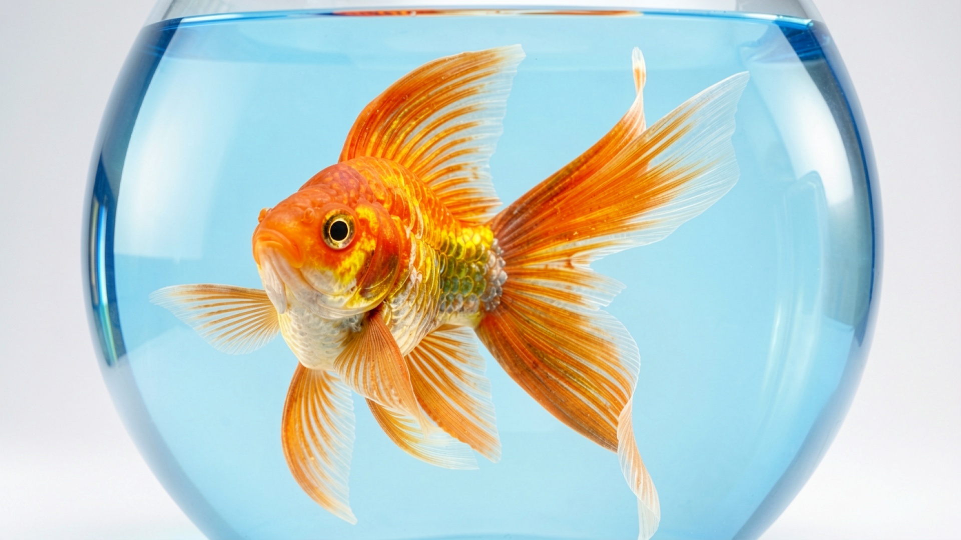 Золотая рыбка в голубом стеклянном аквариуме