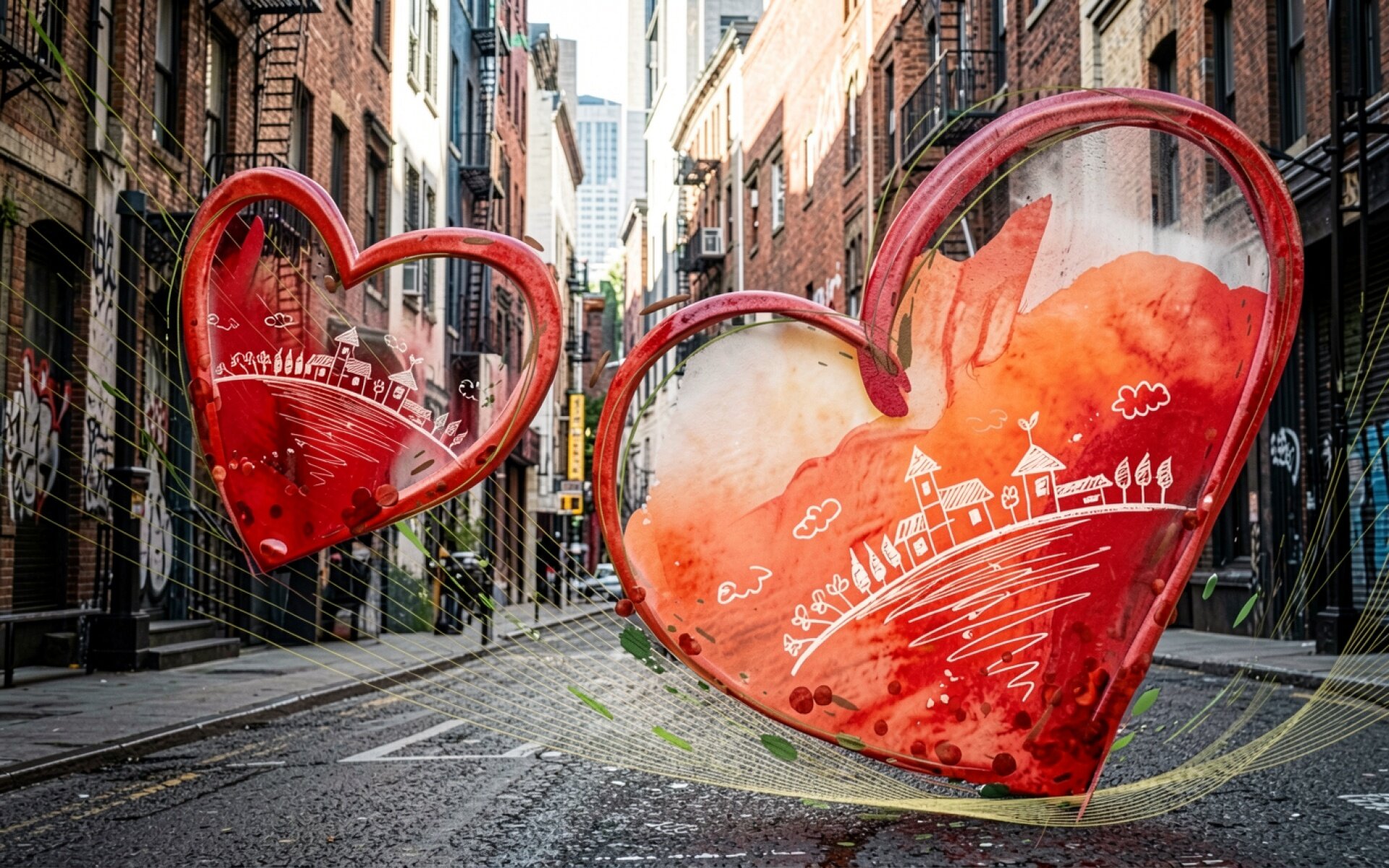 Красные стеклянные сердца в городском переулке