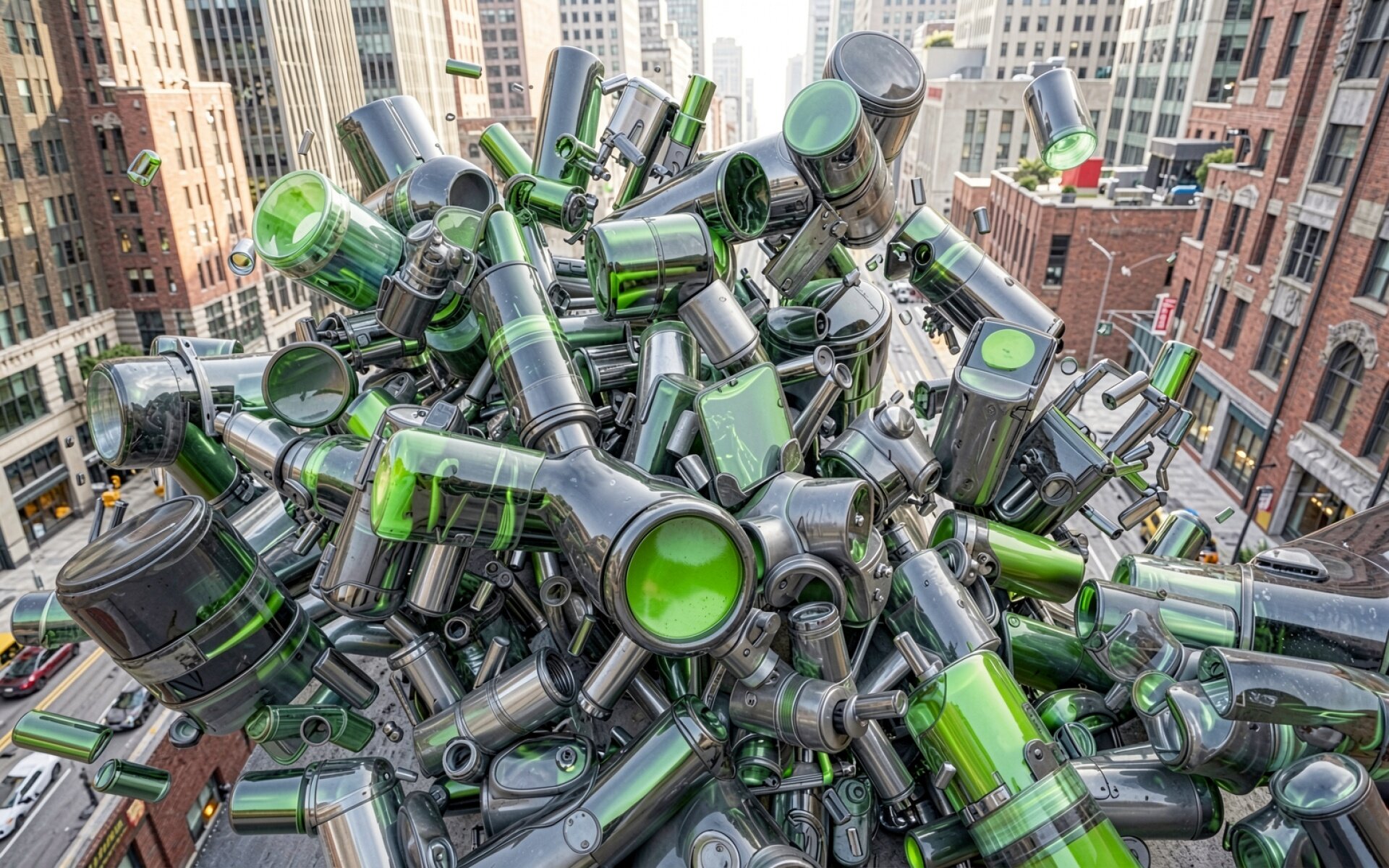 Стеклянные зеленые цилиндры в городском пейзаже