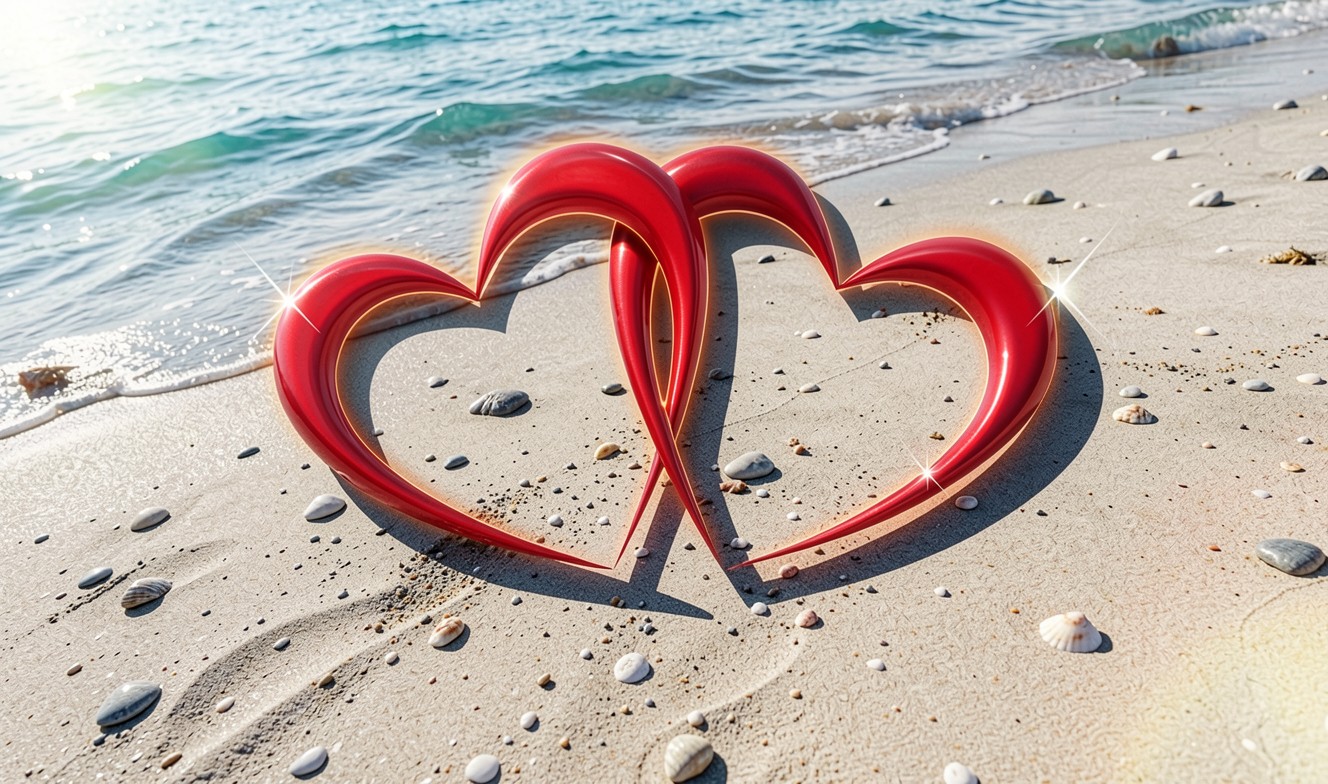 Два красных стеклянных сердца на песчаном пляже