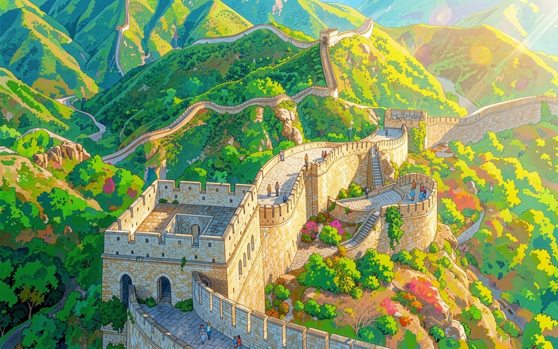 Великая Китайская стена в солнечном летнем пейзаже