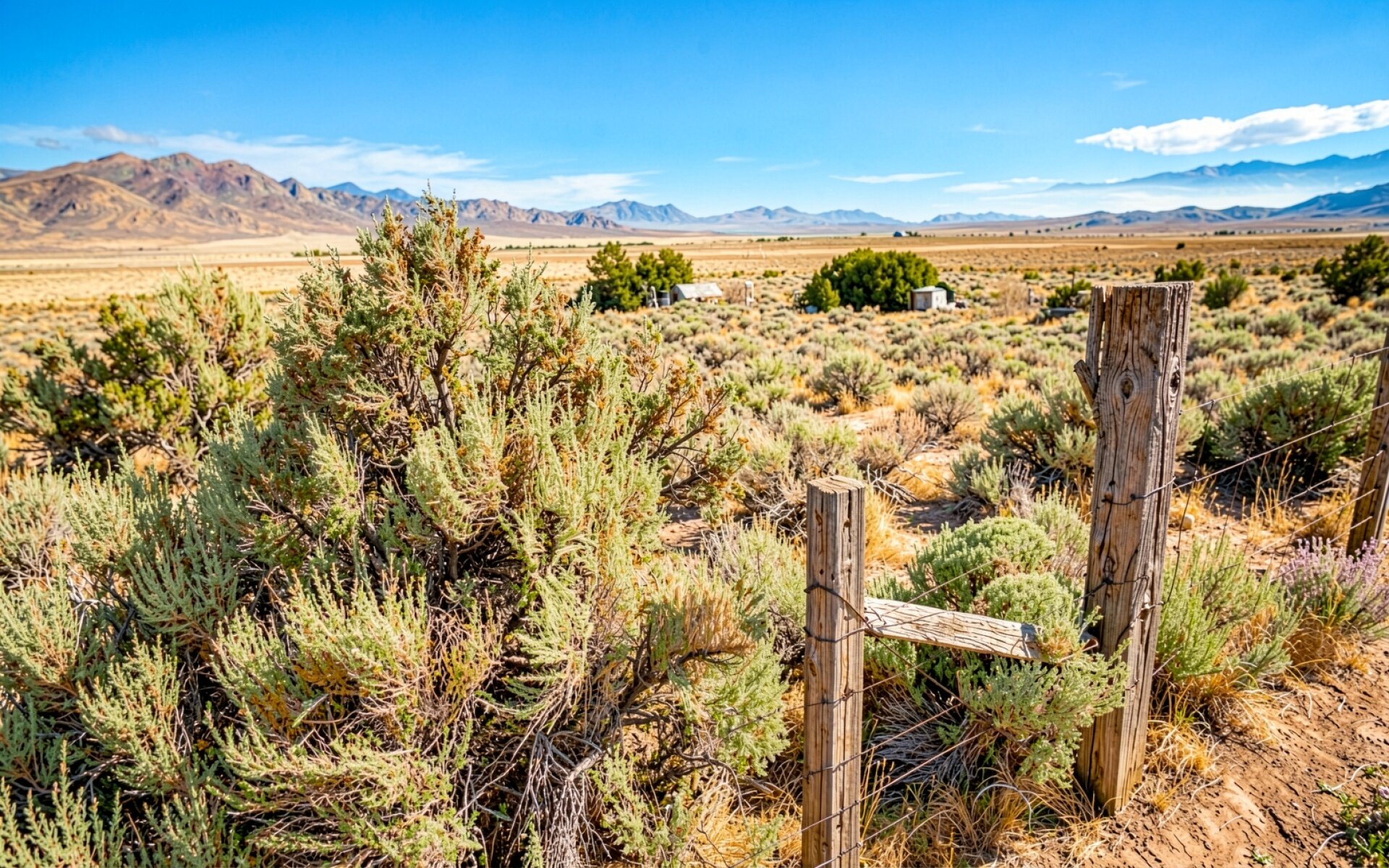 Засушливая степь с деревянным забором и горами