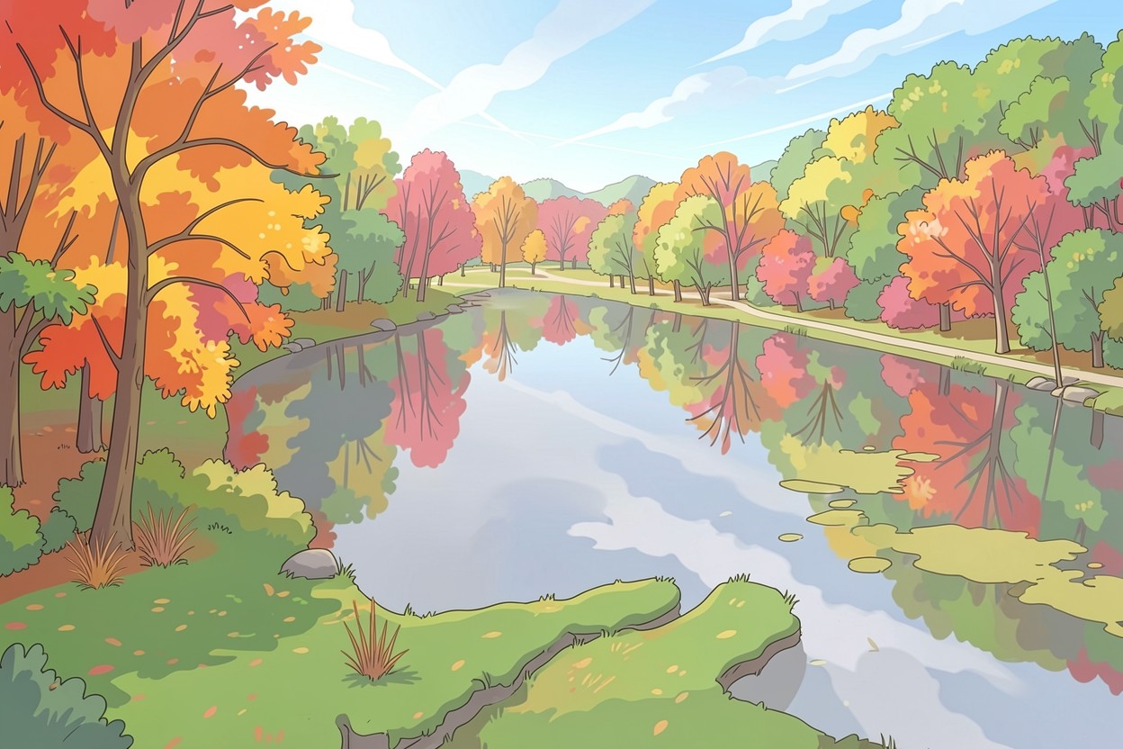 Осенний пейзаж с озером в стиле иллюстрации