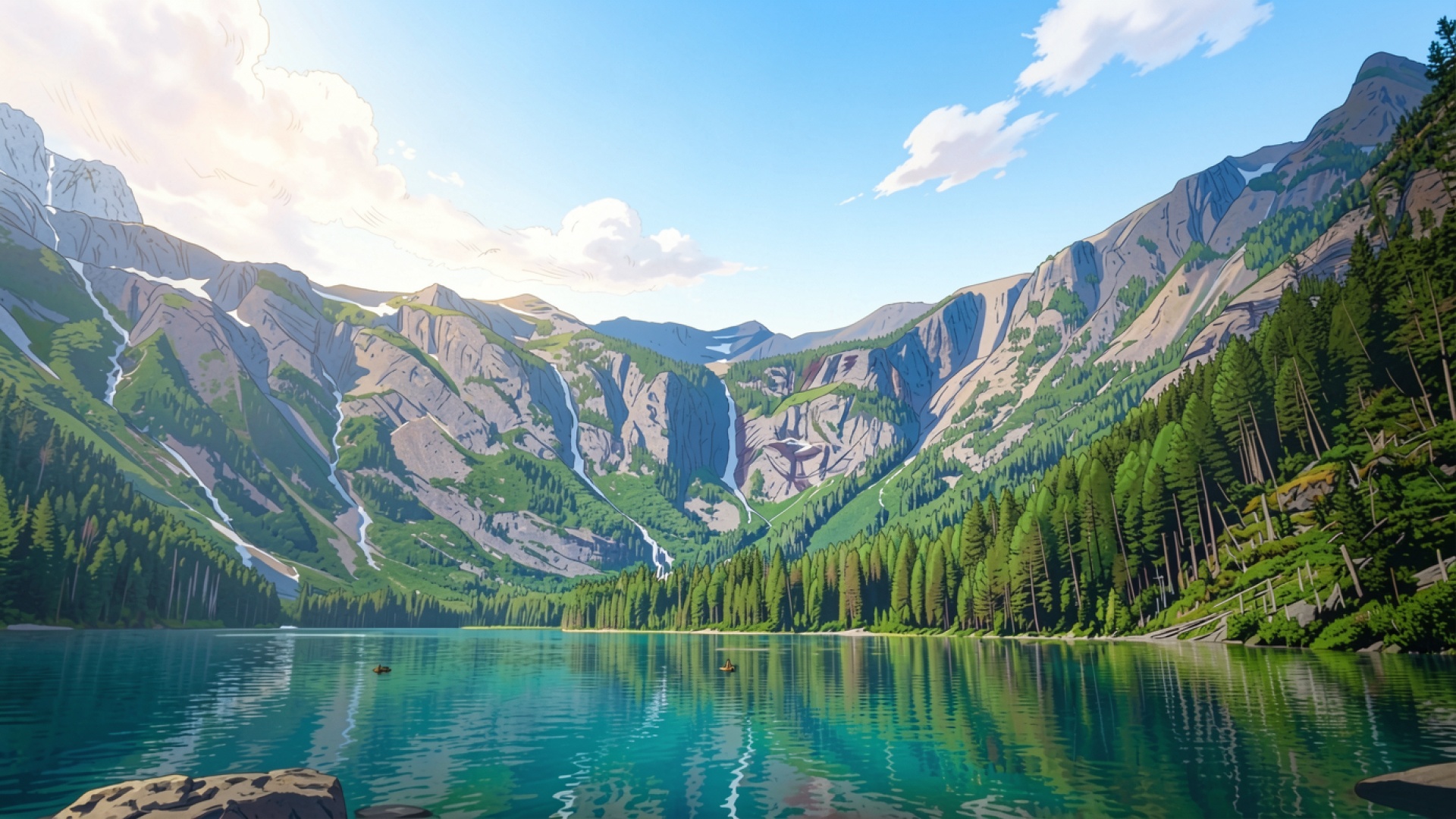 Горное озеро с хвойным лесом в стиле аниме